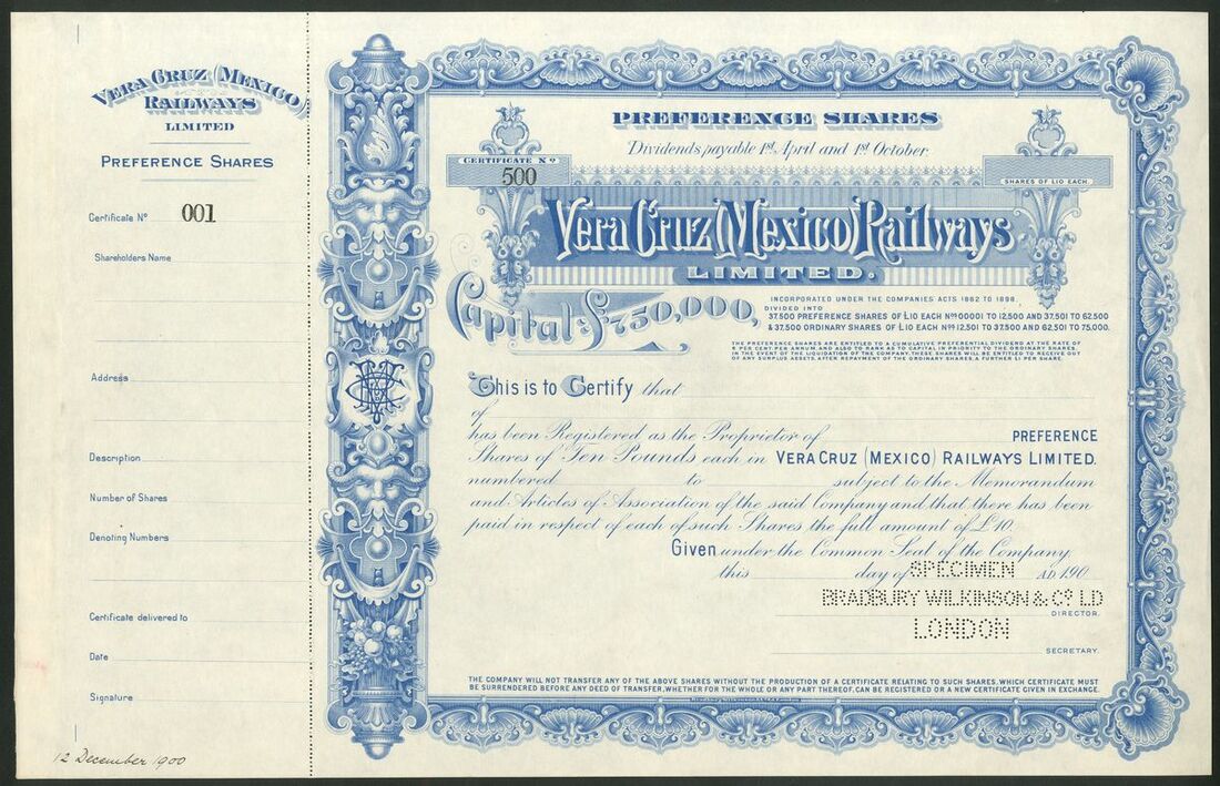 Mexico: Vera Cruz (Mexico) Railways Limited, £10 preference shares, a specimen certificate for the Bradbury, Wilkinson archives, 190-, #001-500, ornate border, blue, with counterfoil, perforated SPECIMEN. EF and rare.
