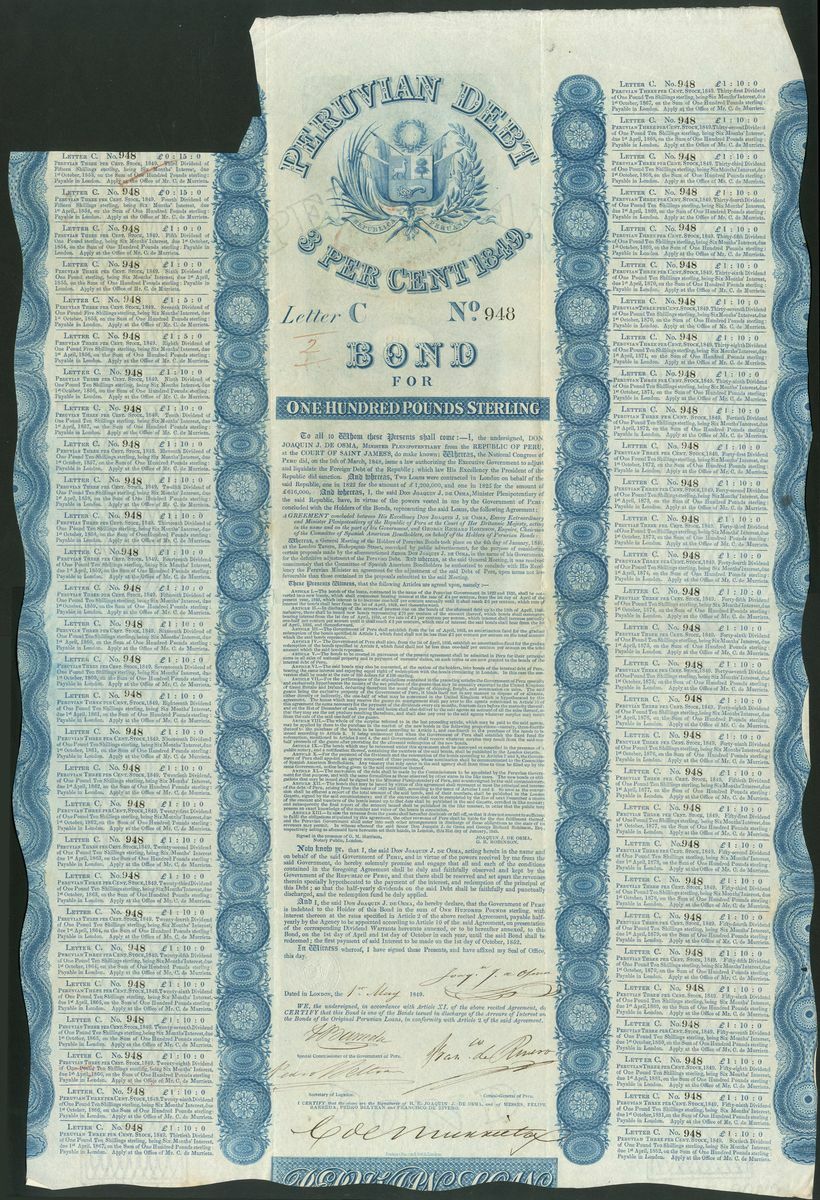 Peru: Peruvian 3% Debt, 1849, bond for £100, #948, coat of arms at top, blue printing by Perkins, Bacon & Petch, coupons at either side. Issued to redeem 3 earlier loans then in default. These in turn were replaced by a new loan in 1853. GVF and extremely rare. 6 examples found in 2018.