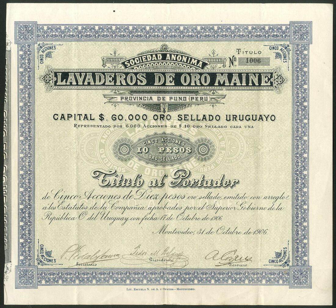 Peru: Lavaderos de Oro Maine, 5 shares of 10 pesos, Montevideo 1906, #1006, ornate border, blue. A Uruguayan company owning gold bearing property in the Province of Puno, Peru. VF.