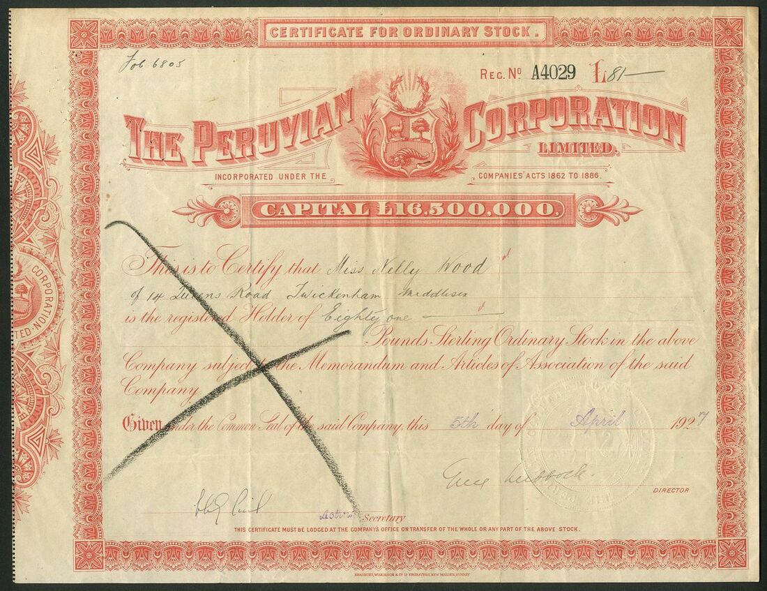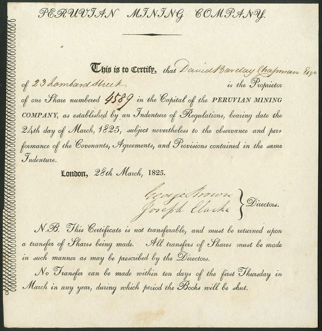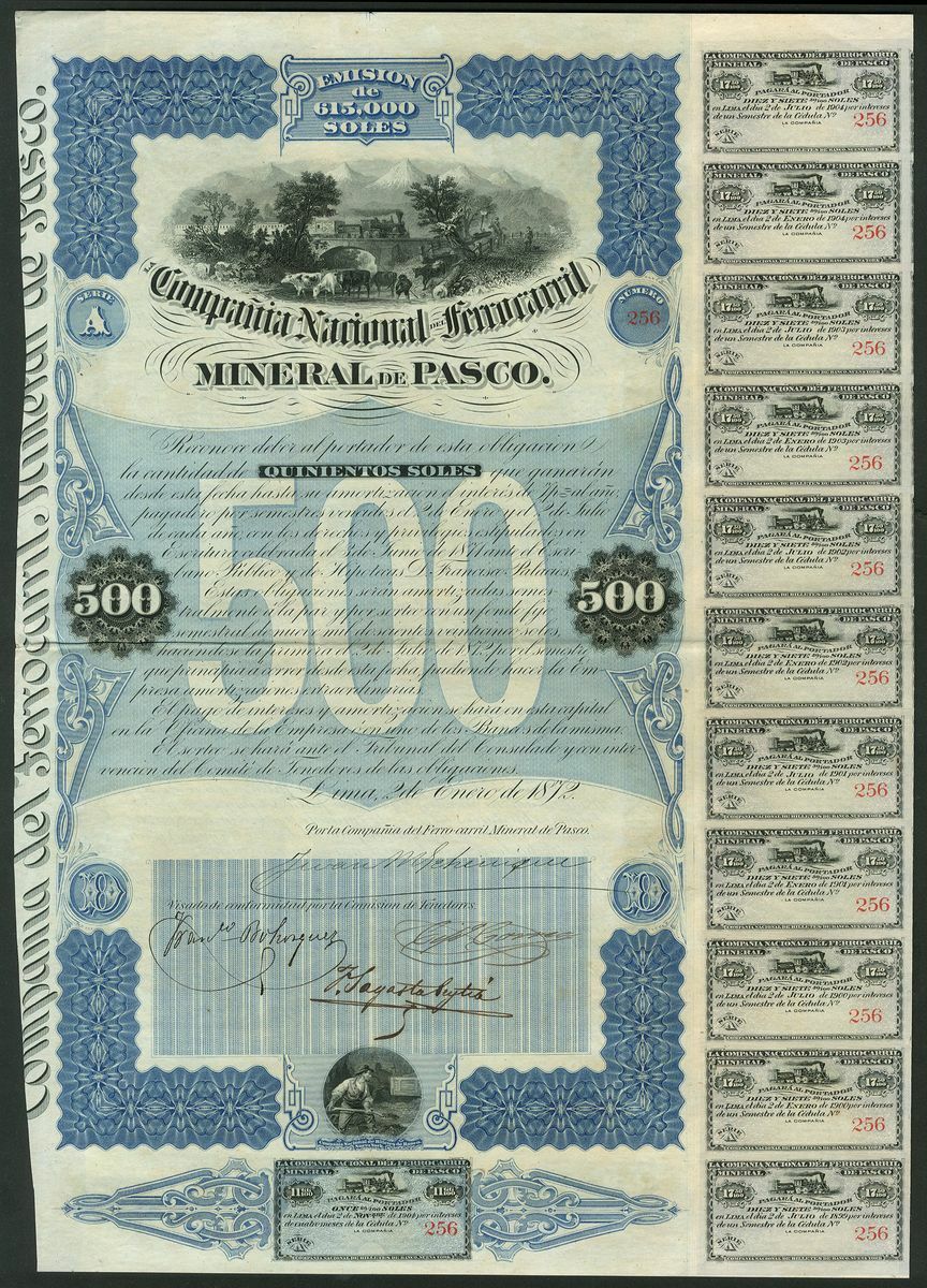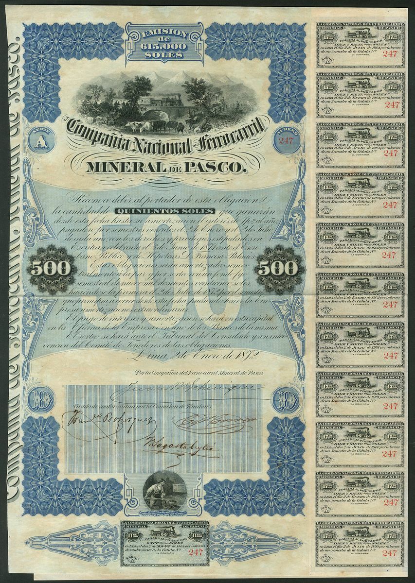 Peru: Peruvian Mining Company, one share, London 1825, #4589, issued to David Barclay Chapman, Banker, ornate scrollwork at left, black printing, together with Compania Nacional del Ferrocarril Mineral de Pasco, 7% bonds for 500 soles, 1872, attractive vignette at top, blue, with coupons, 2 examples, and, Peruvian Corporation Limited, ordinary stock, red, cancelled. This company was formed in 1889 to take over the Government debt for the building of railways. VF and better (4).