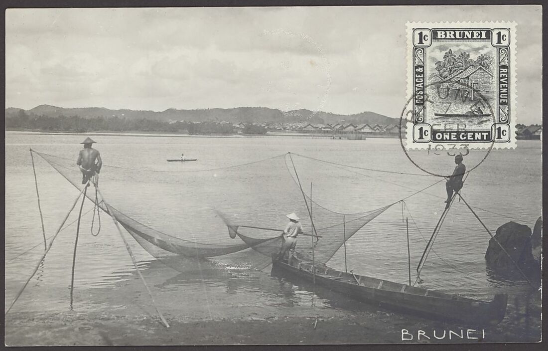 1933 (7 Feb.) unaddressed photographic postcard of fishermen bearing, on picture side, 1c. tied by Brunei c.d.s.,  fine