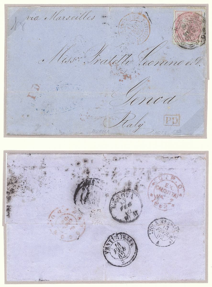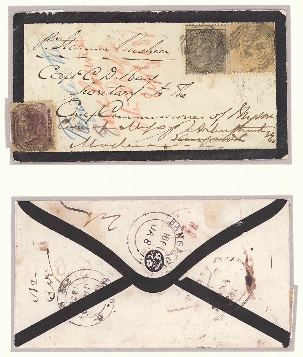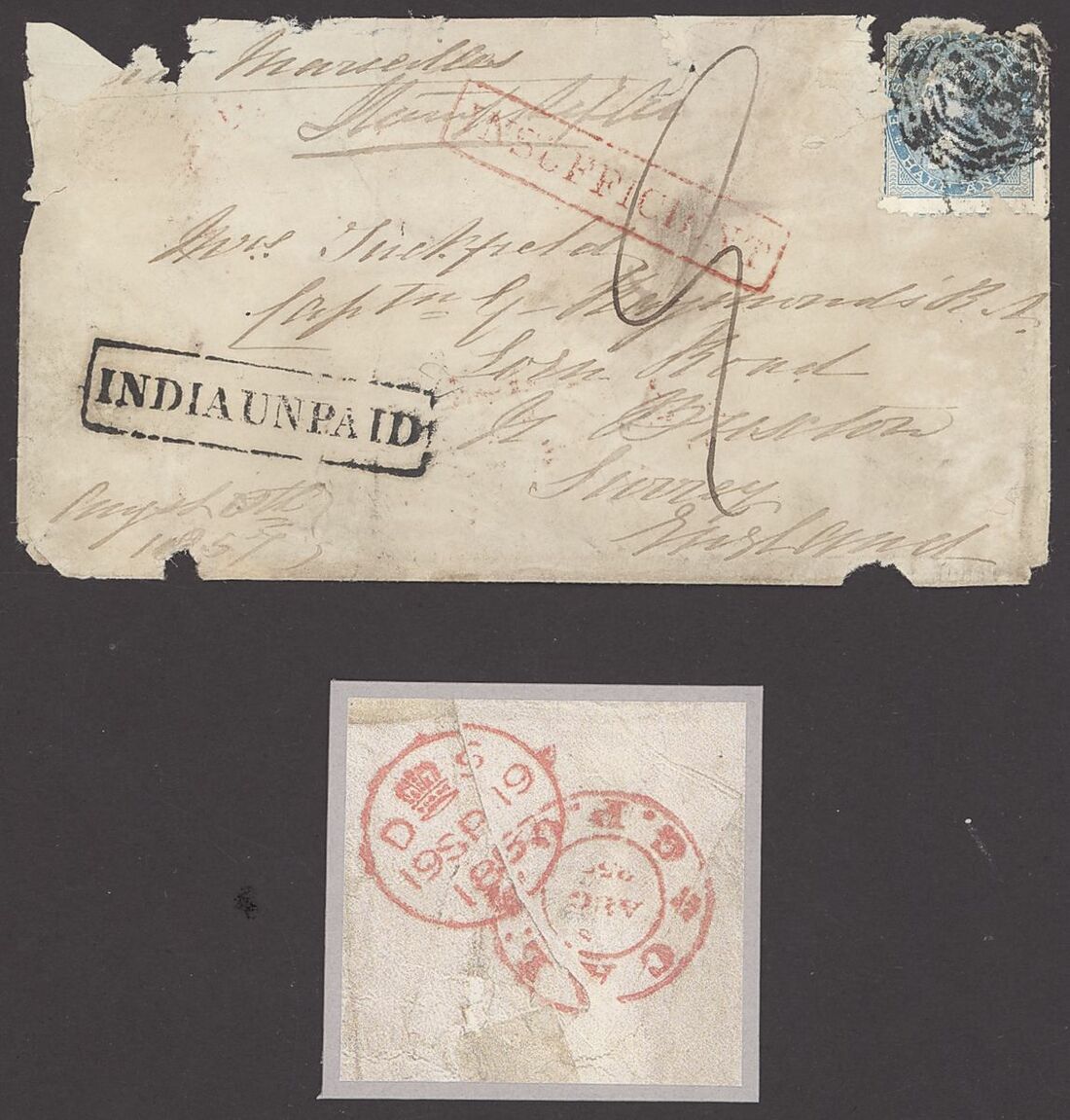 1856 envelope from Rangoon to Calcutta bearing 1856 1a. tied by "B/156" obliterator; 1857 envelope (faults) from Rangoon to England bearing 1856 ½a. tied by "B/156" obliterator, showing framed