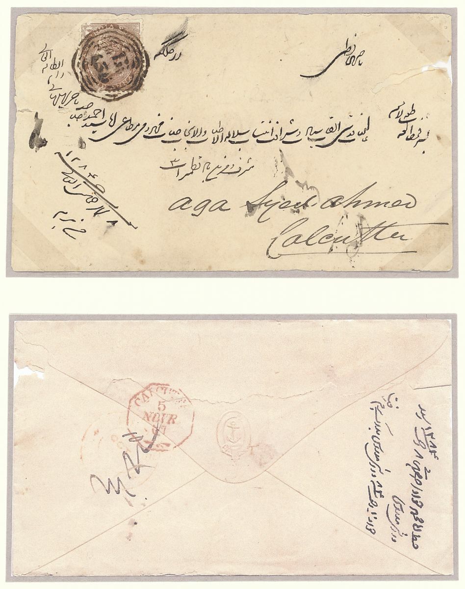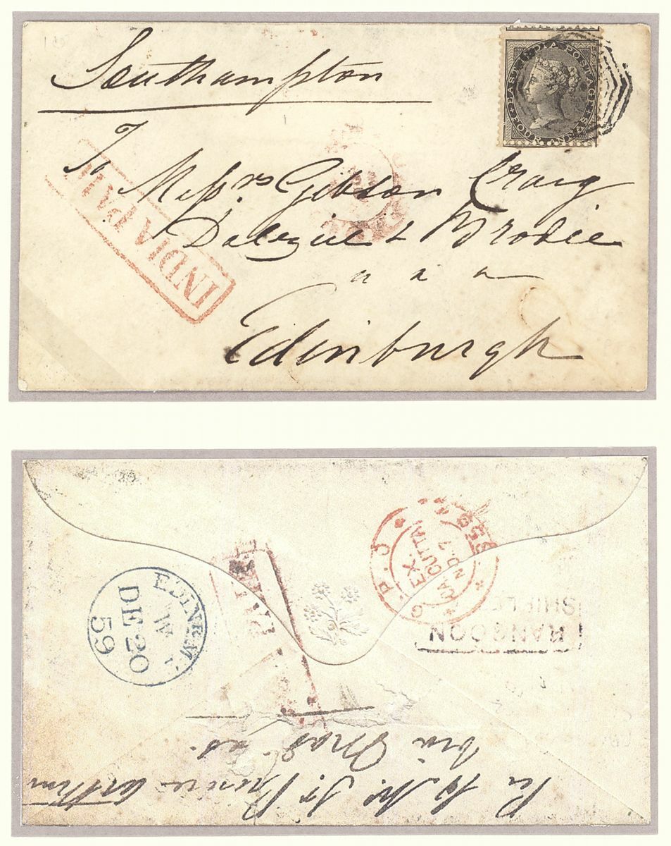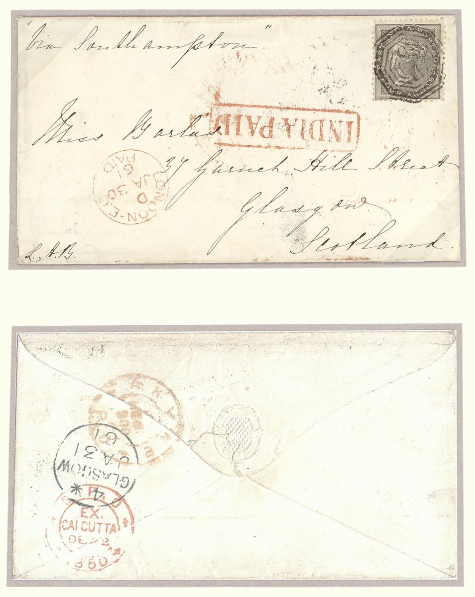 1856 envelope from Rangoon to Calcutta bearing 1856 1a. tied by "B/156" obliterator; 1857 envelope (faults) from Rangoon to England bearing 1856 ½a. tied by "B/156" obliterator, showing framed