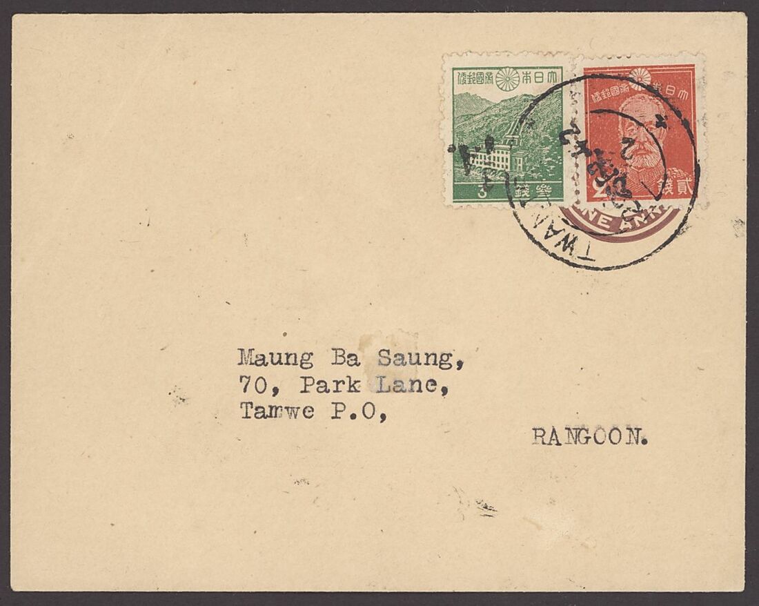 1942 (22 Sept.) day of issue envelope from Twante to Tamwa bearing ½a. on 2s. and ¾a. on 3s., both with surcharge inverted, fine. S.G. J48a, J49a