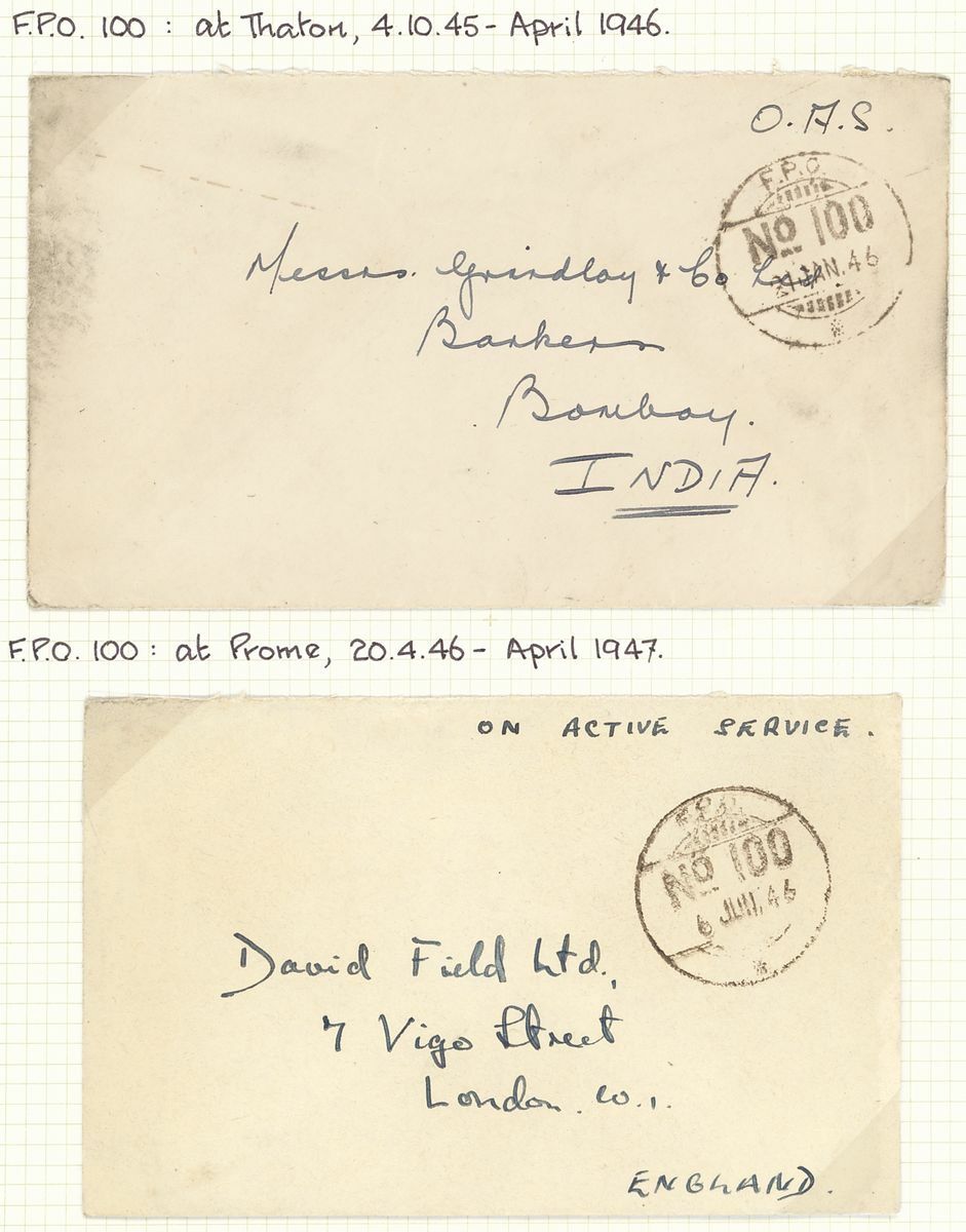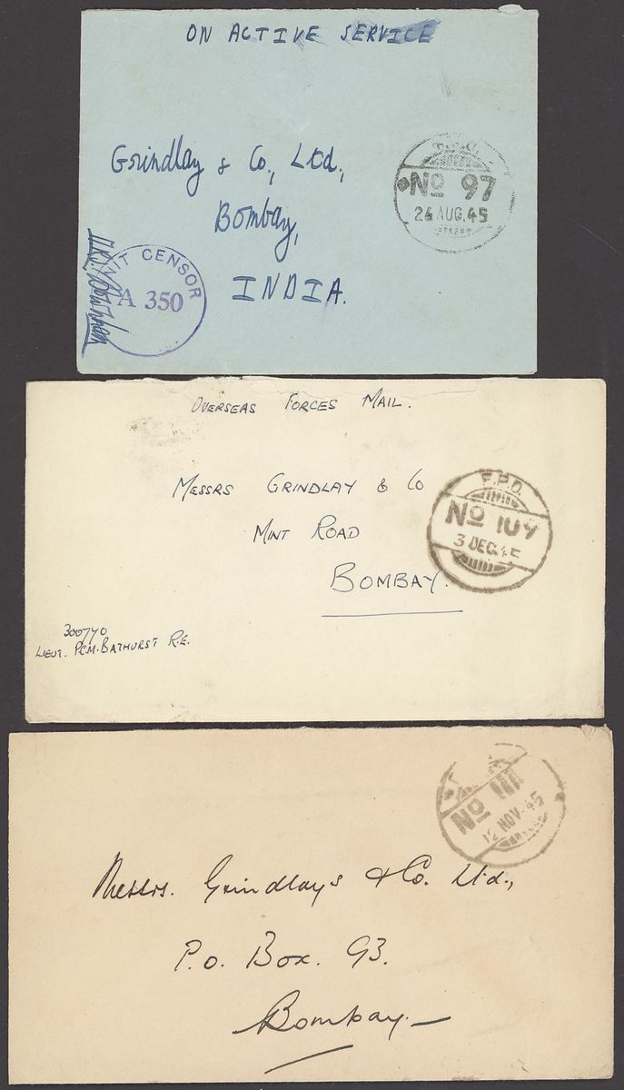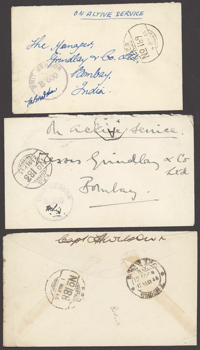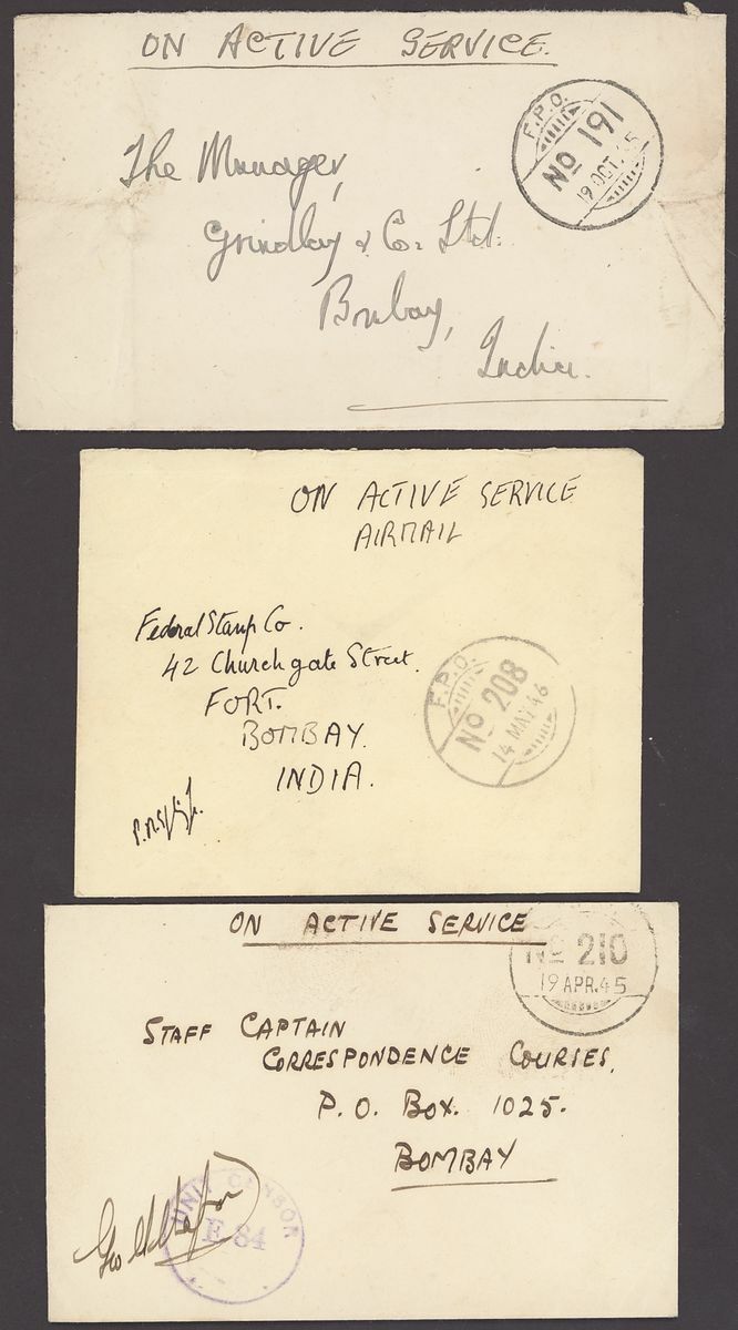 1944-46 envelopes and Air Letters, mostly addressed to India, showing F.P.O. Nos. 71, 77, 80, 82 (2), 97, 100 (3), 109, 111, 120, 123, 138, 169, 183, 188, 191, 208, 210, S-595, 602, 606, 609 and 639; condition generally fine