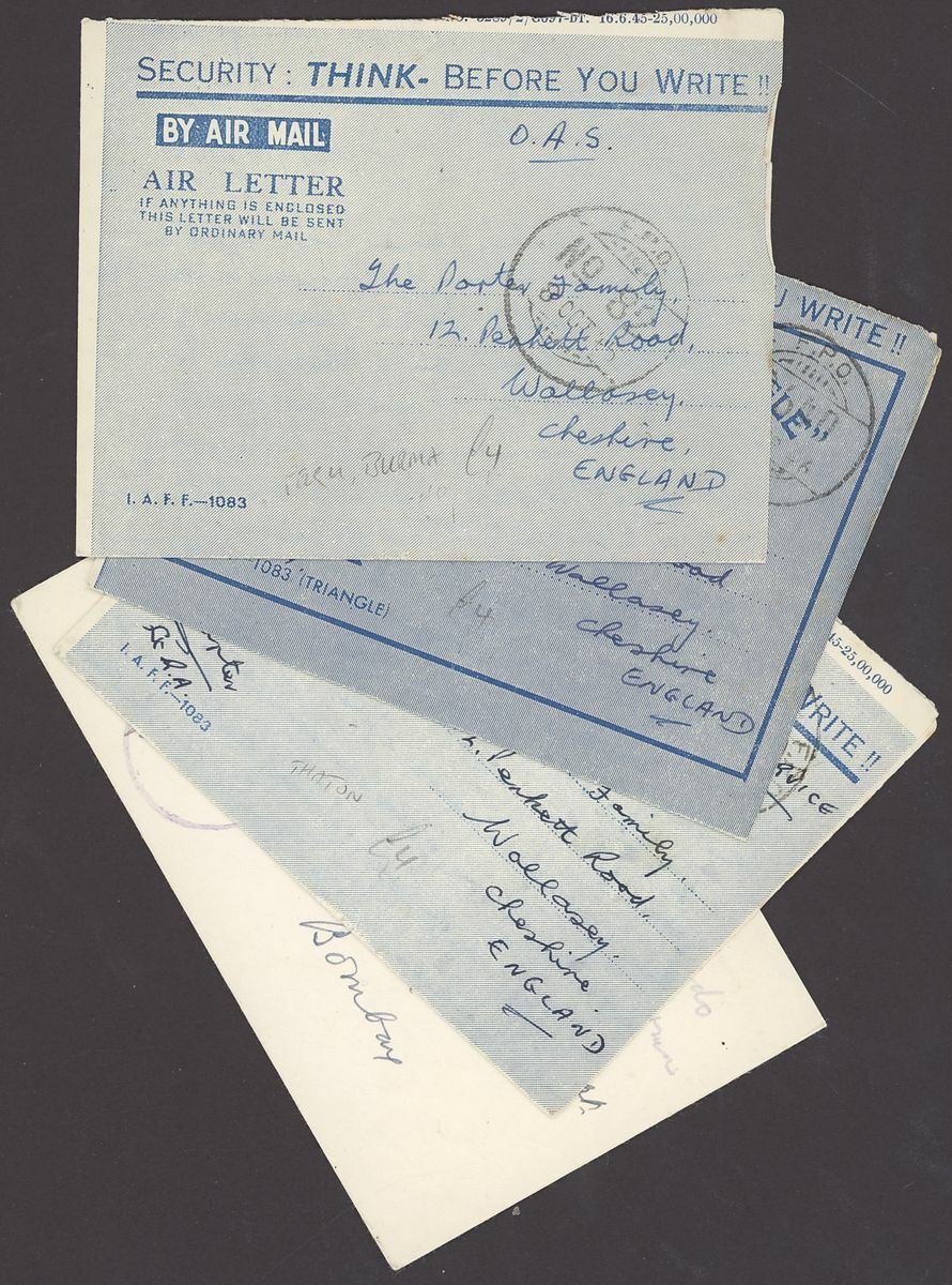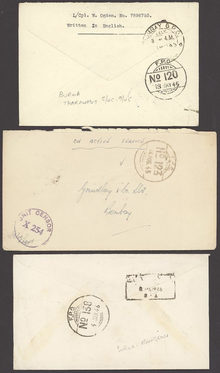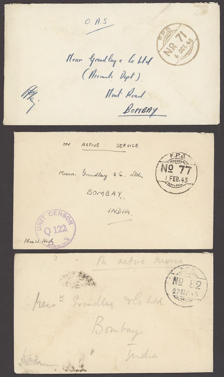 1944-46 envelopes and Air Letters, mostly addressed to India, showing F.P.O. Nos. 71, 77, 80, 82 (2), 97, 100 (3), 109, 111, 120, 123, 138, 169, 183, 188, 191, 208, 210, S-595, 602, 606, 609 and 639; condition generally fine