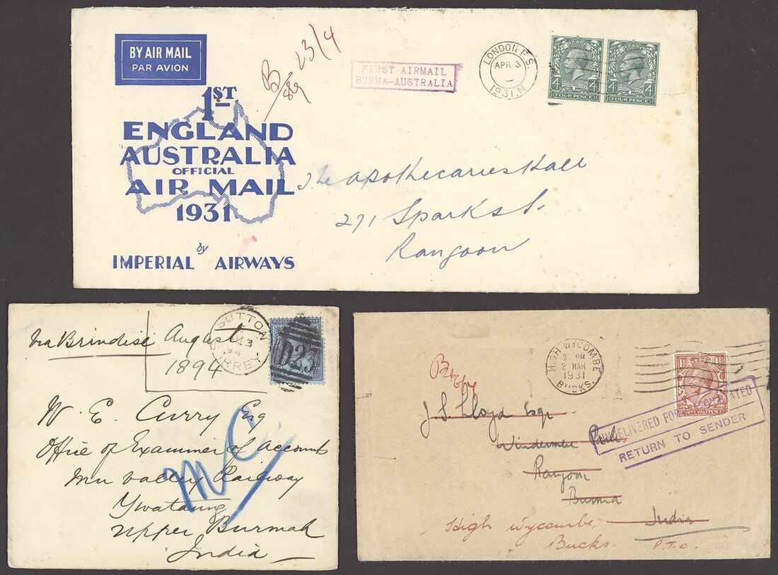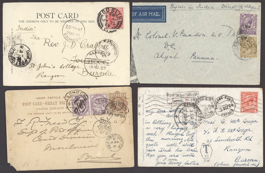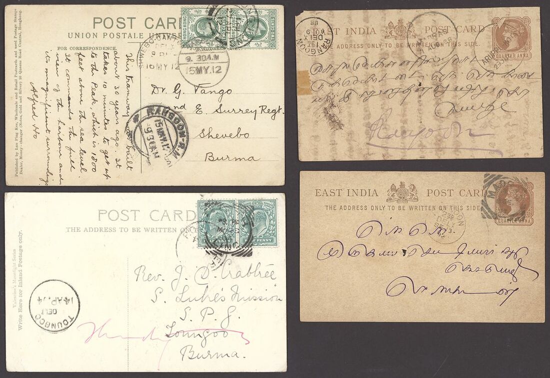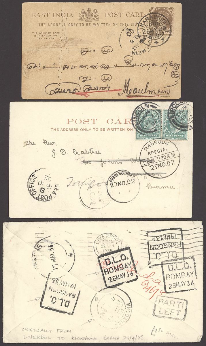 1888-1936 envelopes (11) and cards (13, mostly stationery) from Hong Kong, India (3), Straits Settlements and UK (19), three with Rangoon D.L.O. d..s. and one with Rangoon Cantonment Unpaid d.s. A useful group