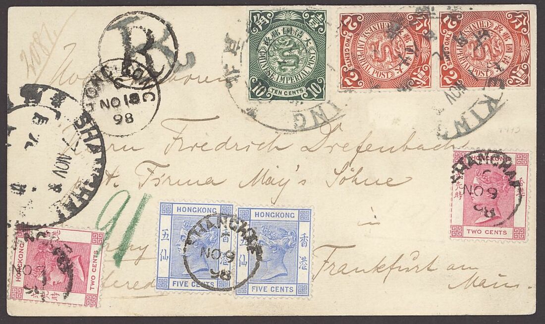 1898 (1 Nov.) hand painted postcard registered to Germany bearing C.I.P. 2c. pair and 10c., tied by Peking Dollar Chop c.d.s. used with Hong Kong 2c. carmine (2) and 5c. blue (2) cancelled by Shanghai c.d.s. (9.11) alongside transit Shanghai Dollar Chop (7.11) and Hong Kong c.d.s (18.11), fine and desirable.
