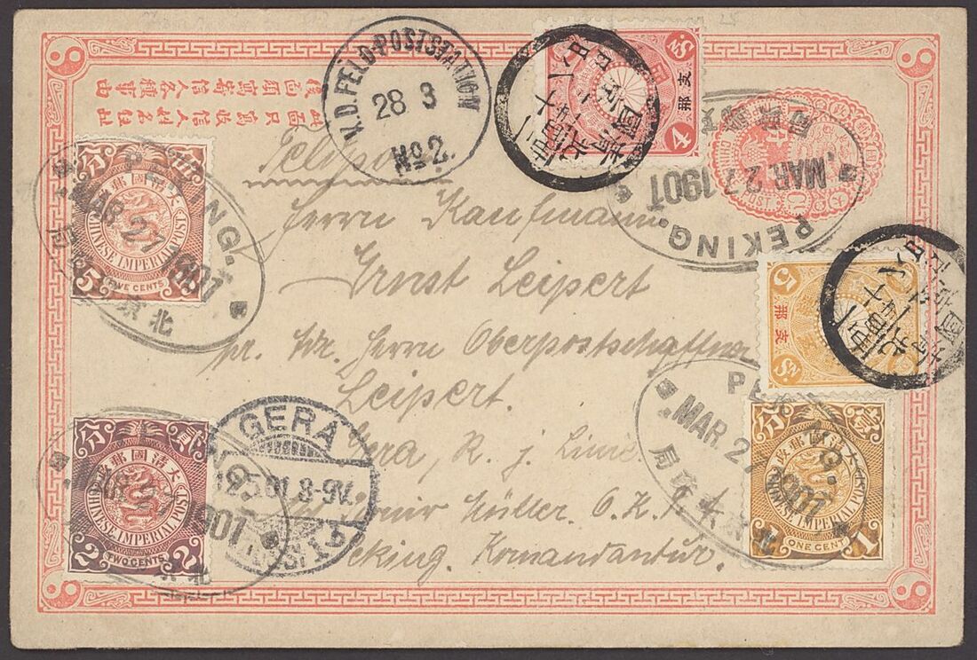 1901 (27 Mar.) 1c. I.C.P. postal stationery to Germany uprated with C.I.P. 1c., 2c. and 5c. tied by Peking oval c.d.s. used with Japanese P.O. overprint on 4s. rose-red and 5s. orange-yellow tied by Japanese "Peking/(Meiji) 34th Year" c.d.s. (28.3); alongside "