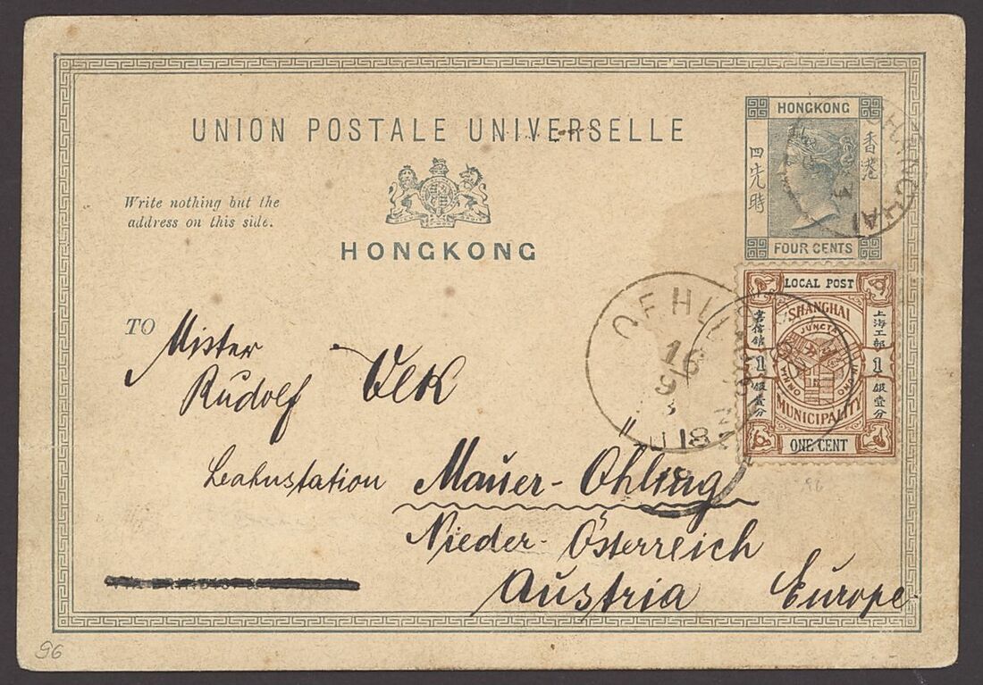1896 Hong Kong 4c. postal stationery to Austria tied by Shanghai d.s. used with Shaghai Local Post 1c. brown and black cancelled by Shanghai d.s. alongside "Oehling" arrival c.d.s. (16.9), usual minor imperfections including light creasing, nevertheless a scarce combination.