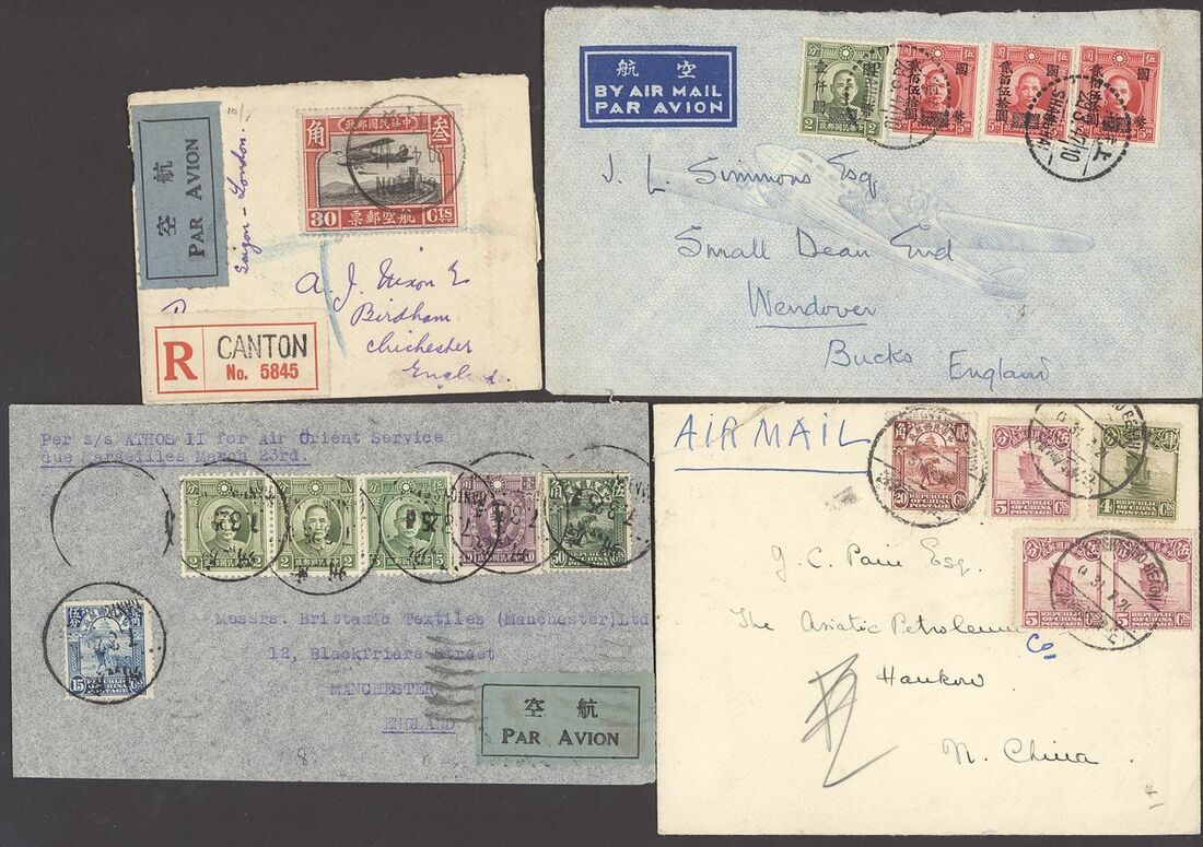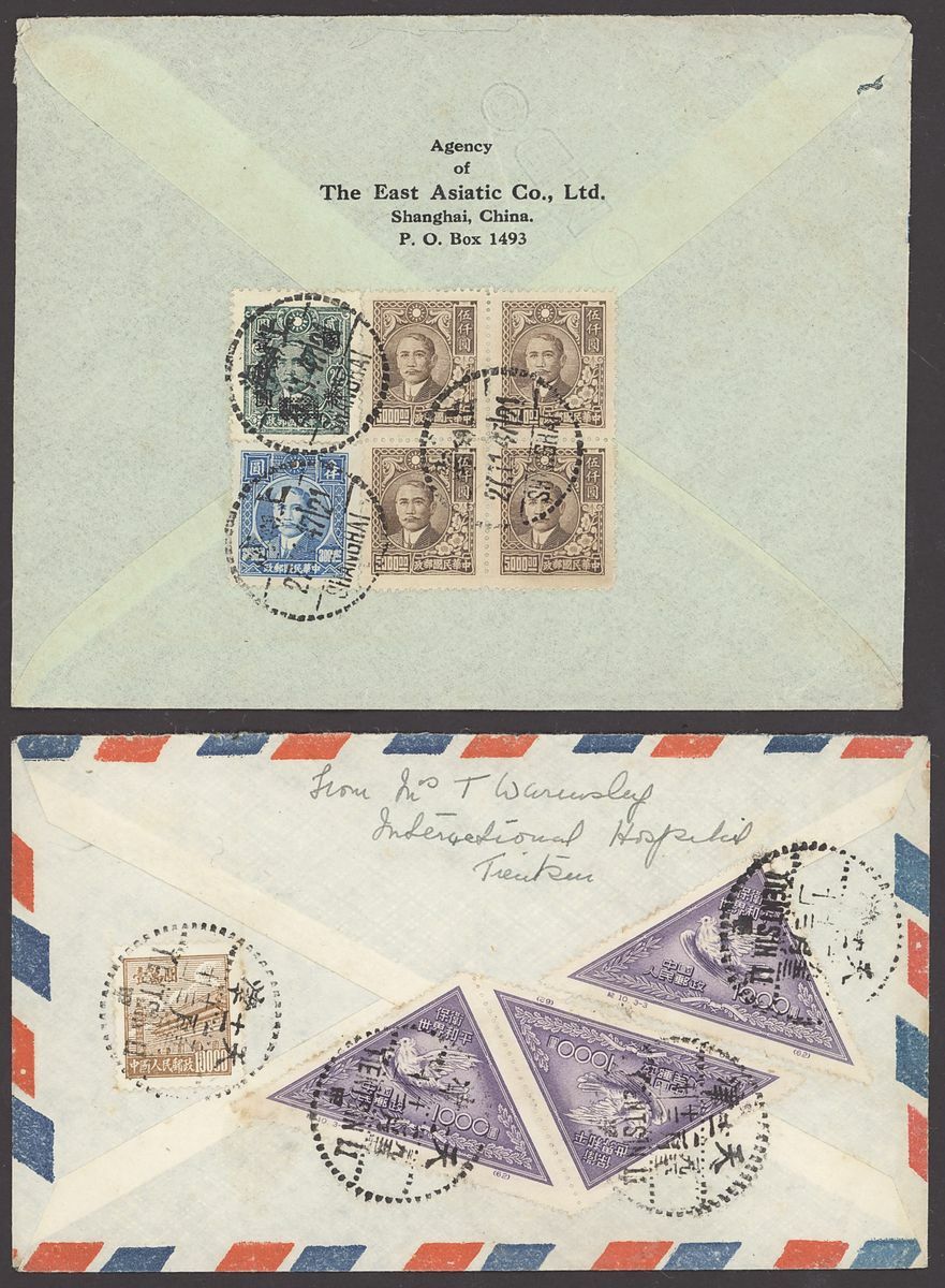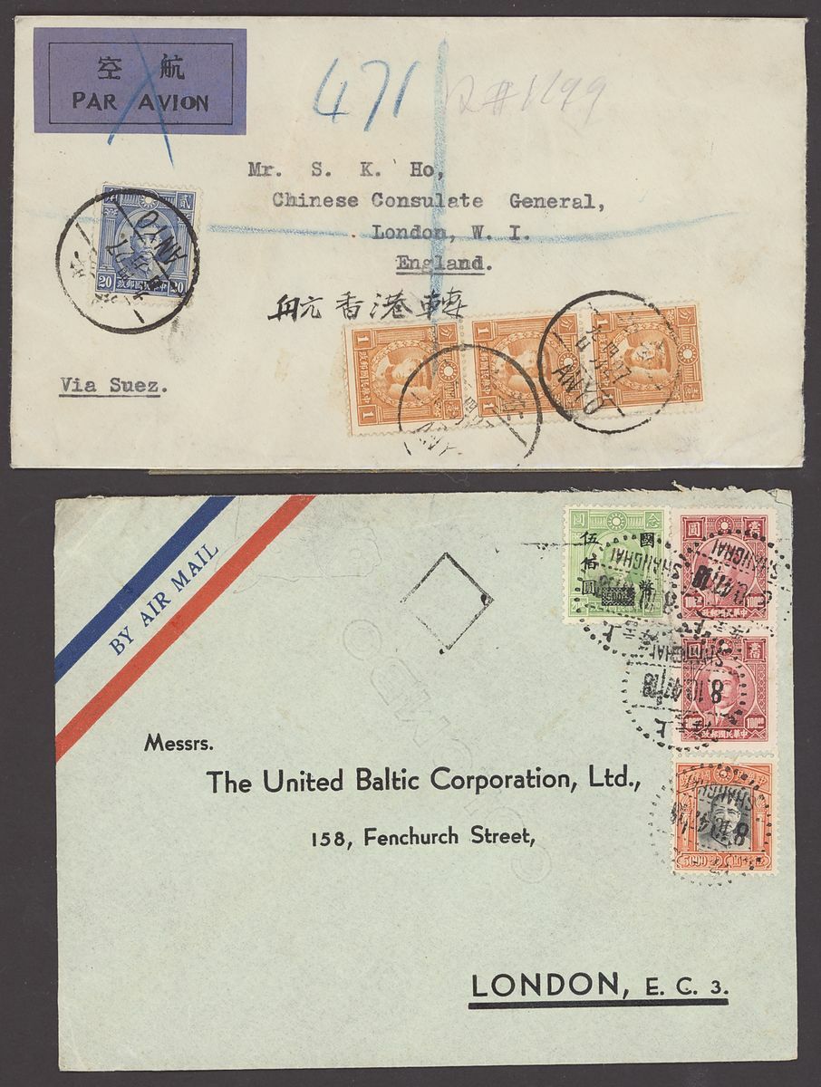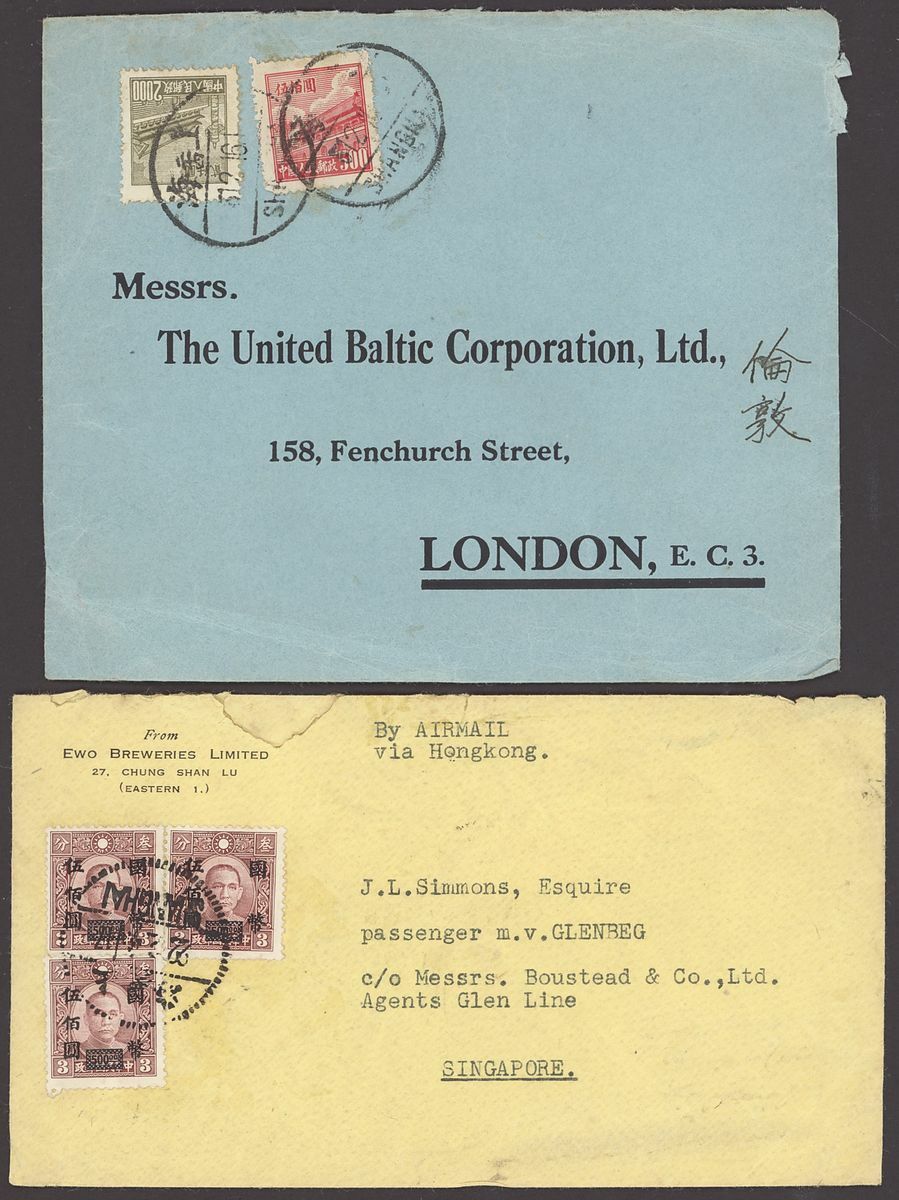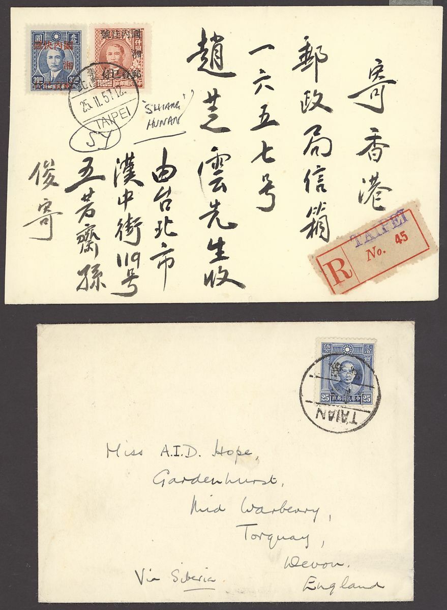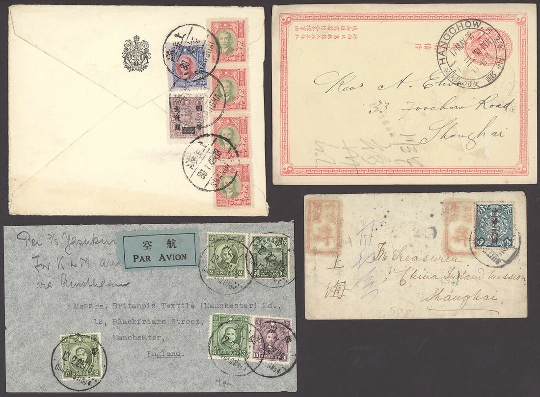 1865-1963 postal history collection (39) including 1865 stampless cover originated from Shanghai (8.2) addressed to U.S.A. via Marseilles, 1898 1c. I.C.P. postal stationery card to Shanghai tied by neat Hangchow "Dollar Chop" and bearing on the reversed boxed "Hangchow Hospital 17 May 1898" cachet in purple, 1912 3c. Waterlow overprint on cover adressed to Shanghai cancelled by "Suiting" bi-lingual d.s.; also a good number of air mails, mixed condition, direct inspection advised.