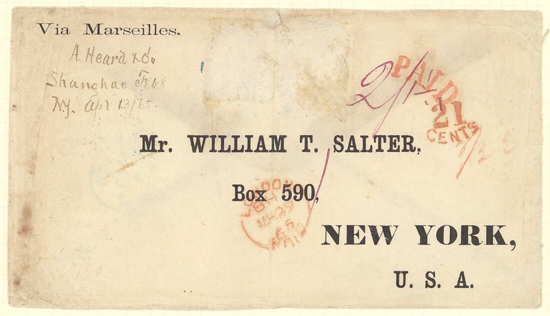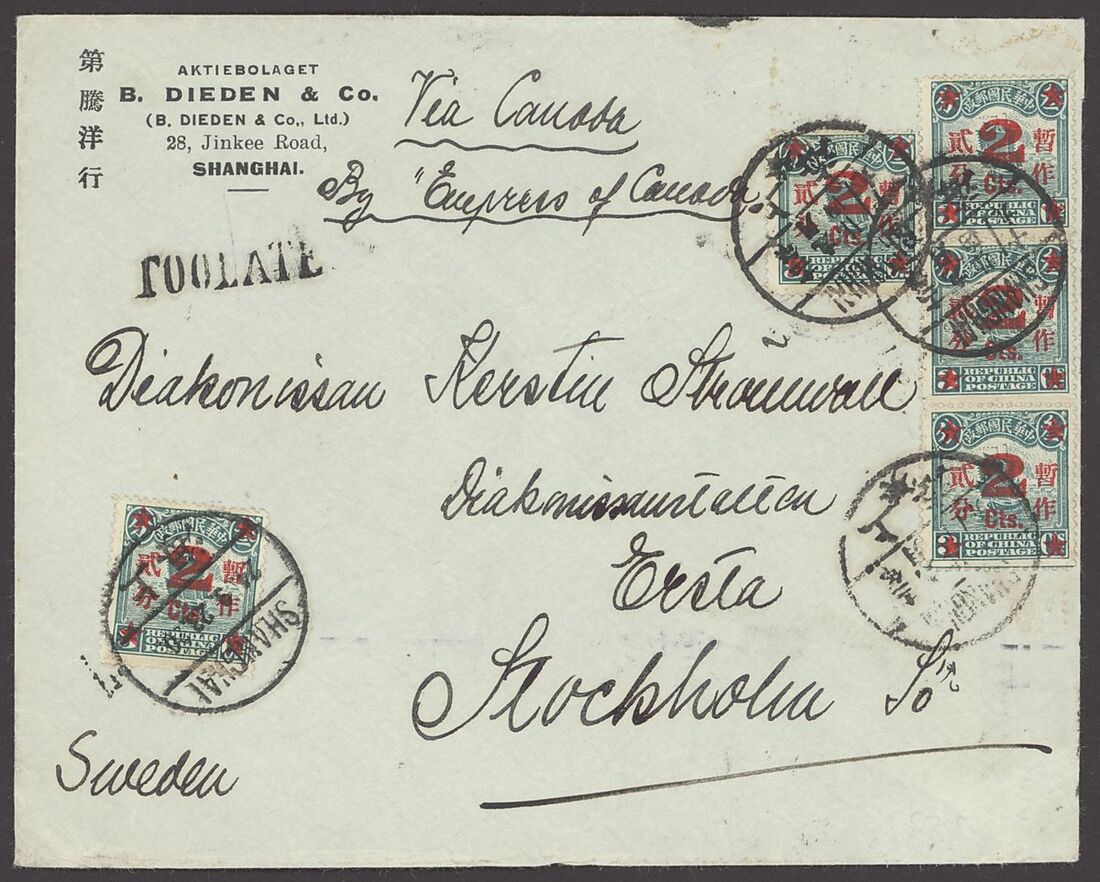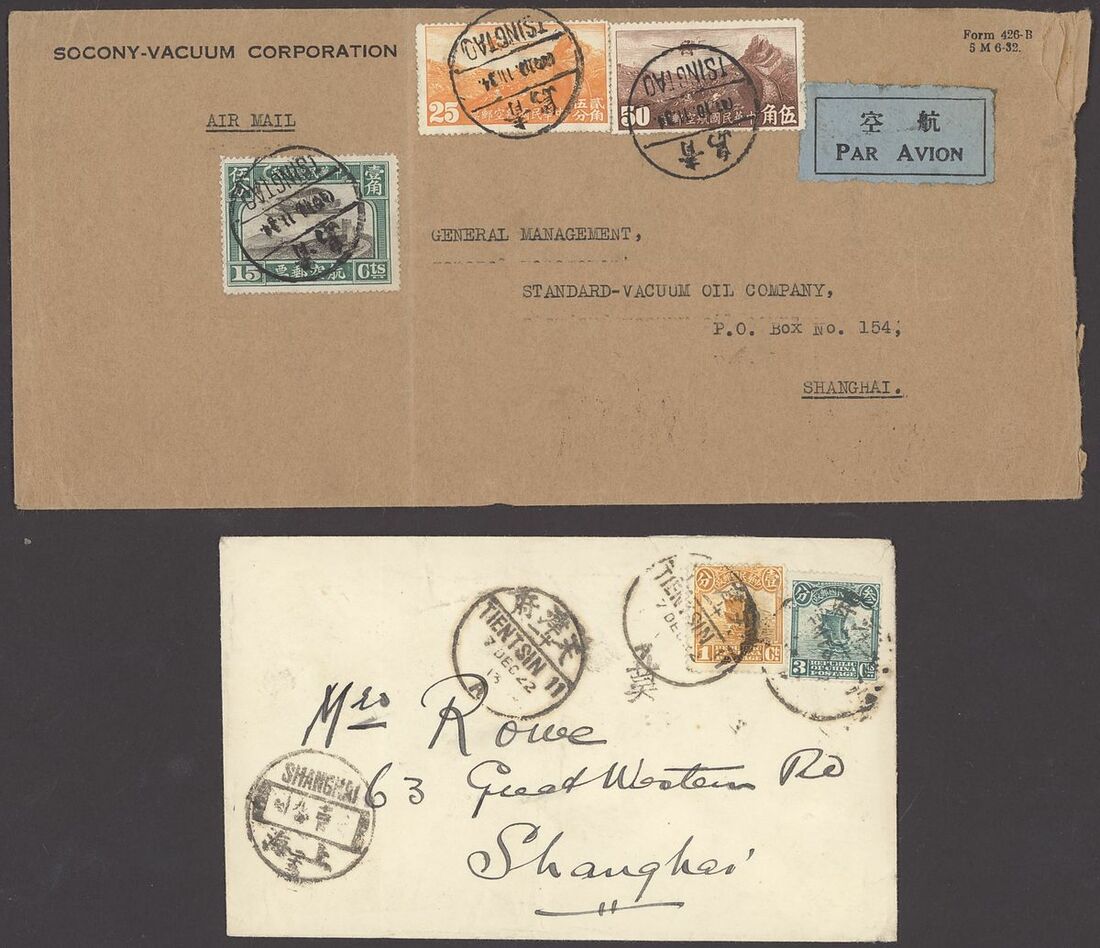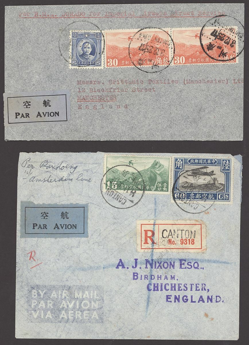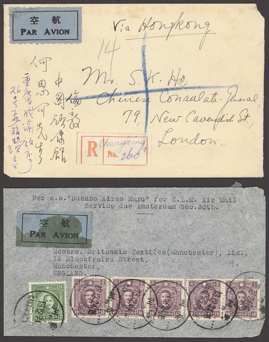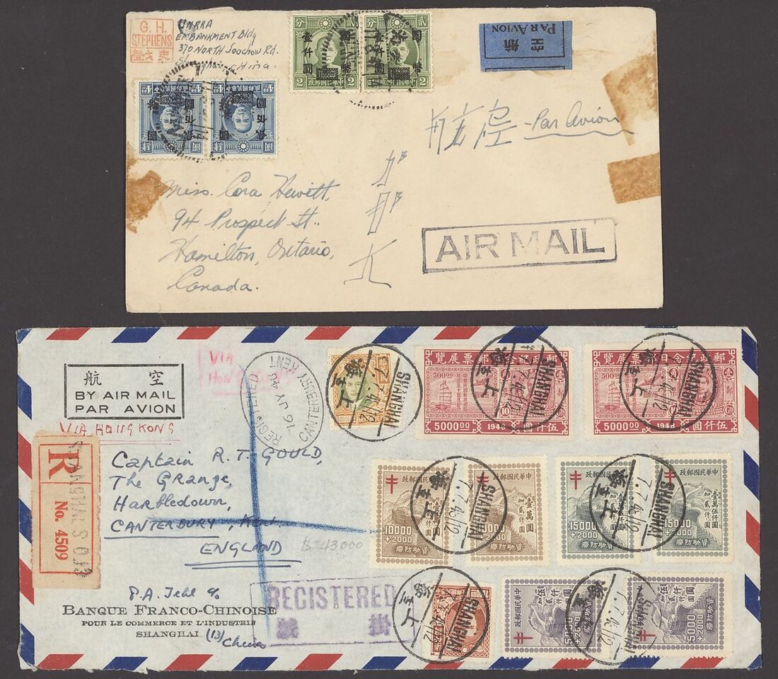 1865-1963 postal history collection (39) including 1865 stampless cover originated from Shanghai (8.2) addressed to U.S.A. via Marseilles, 1898 1c. I.C.P. postal stationery card to Shanghai tied by neat Hangchow "Dollar Chop" and bearing on the reversed boxed "Hangchow Hospital 17 May 1898" cachet in purple, 1912 3c. Waterlow overprint on cover adressed to Shanghai cancelled by "Suiting" bi-lingual d.s.; also a good number of air mails, mixed condition, direct inspection advised.