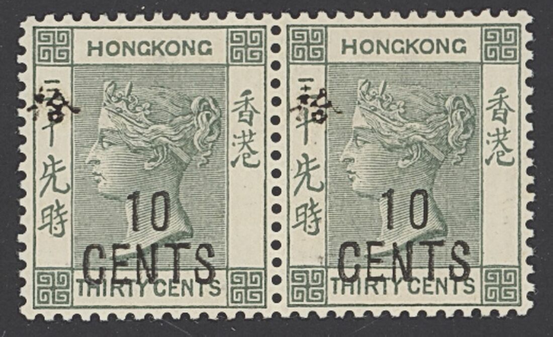 1898 10c. on 30c. grey-green horizontal pair, right stamp showing variety figures '10' widely spaced, very lightly mounted original gum lightly aged, very well centered, fine. S.G. 55/55b,  £780+