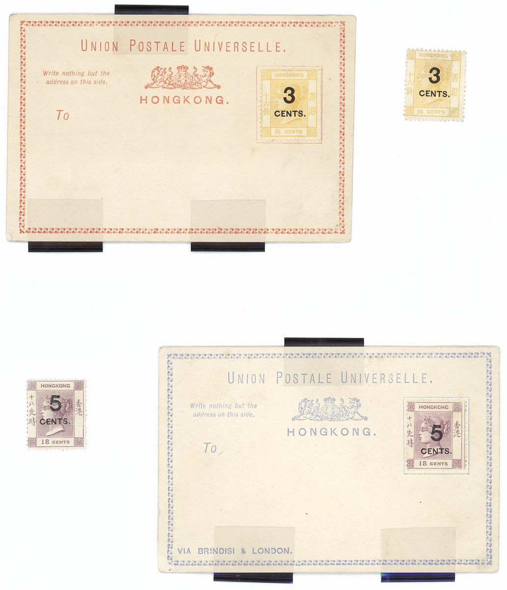 1879 3c. on 16c. yellow (2, unused on red on white card and unused single): 5c. on 18c. lilac (2, unused on blue on white card with "short T" variety and unused single), good to fine. S.G. P1-P2