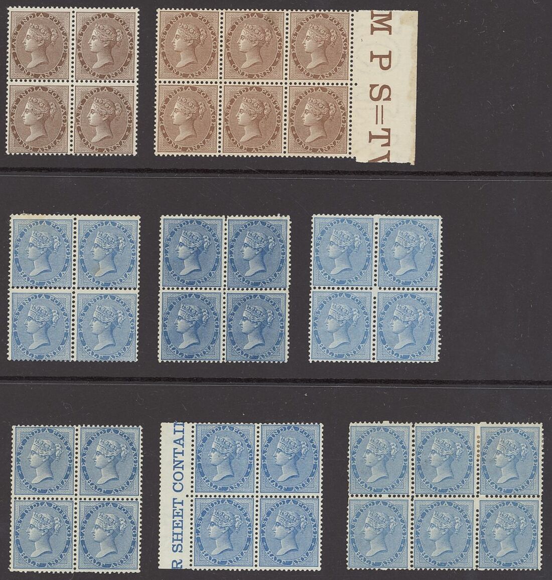 1865 1a. brown, blocks of four and six (3x2 from the right of the sheet), 1873 Die II ½a. blue, five blocks of four and a block of six; mint or part original gum, a few short perfs., good to fine. S.G. 59. 75-76,