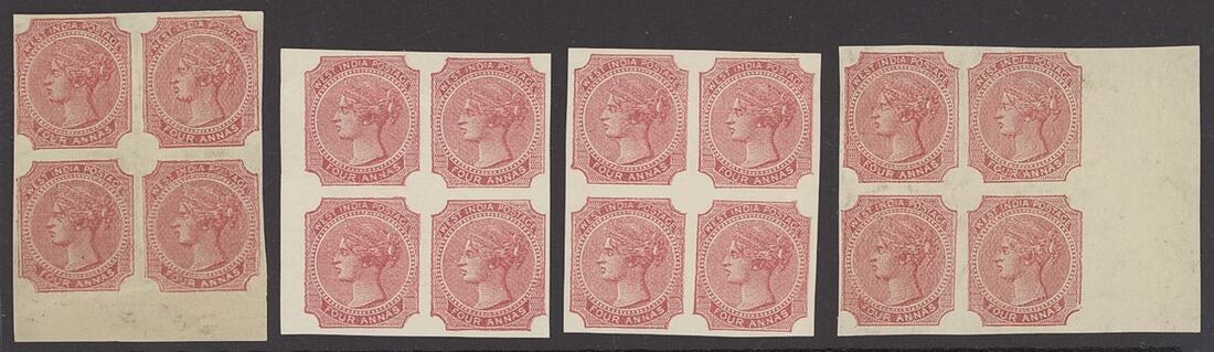 1880 West India imperf. 4a. red essay, four blocks of four, ungummed; some creases, fine