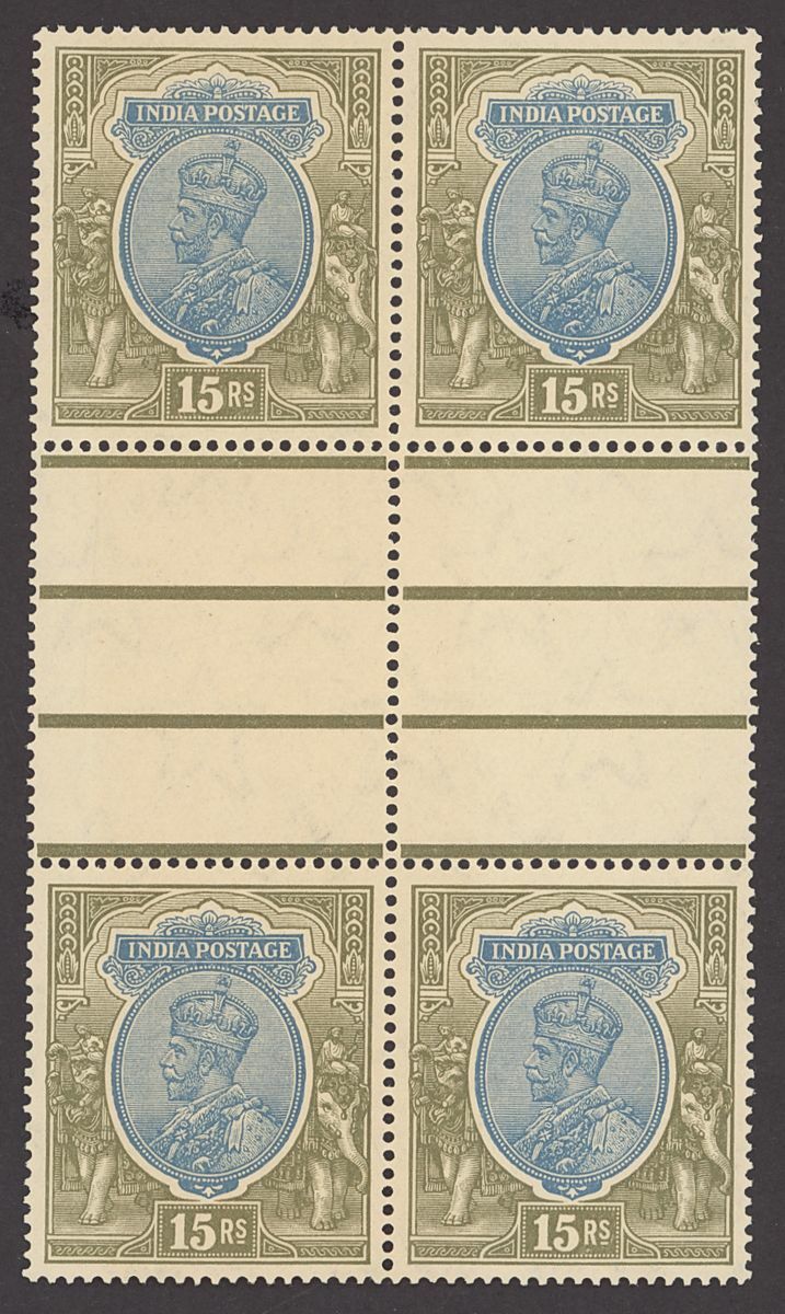 1926-33 15r. blue and olive, watermark upright, block of four with horizontal interpanneau margin between, unmounted mint, usual slightly toned gum; fine. S.G. 218, £400+