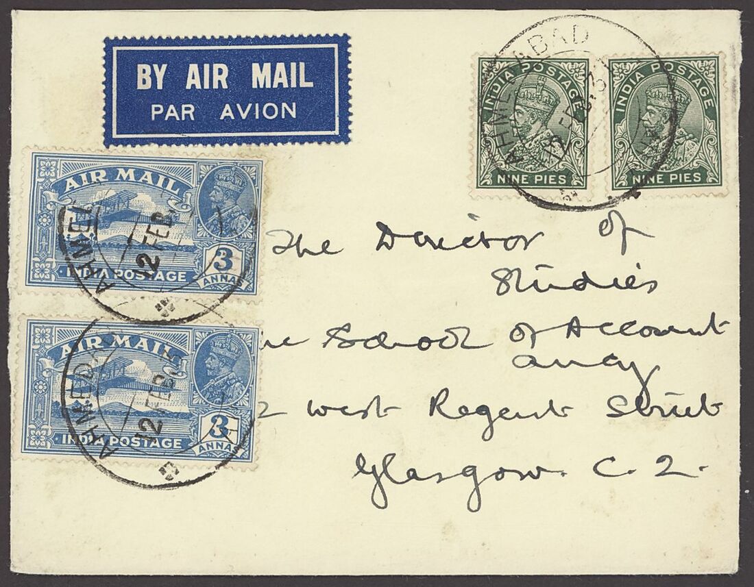 1937 (12 Feb.) envelope from Ahmedabad to Glasgow bearing 1932-36 9p. (2) and 1931 Air 3a. (2), one of which with variety '1' for second 'I'", each tied by Ahmedabad 12.02.37 d.s., filing fold and minor foxing otherwise fine and rare on cover. S.G. 221b, £325++