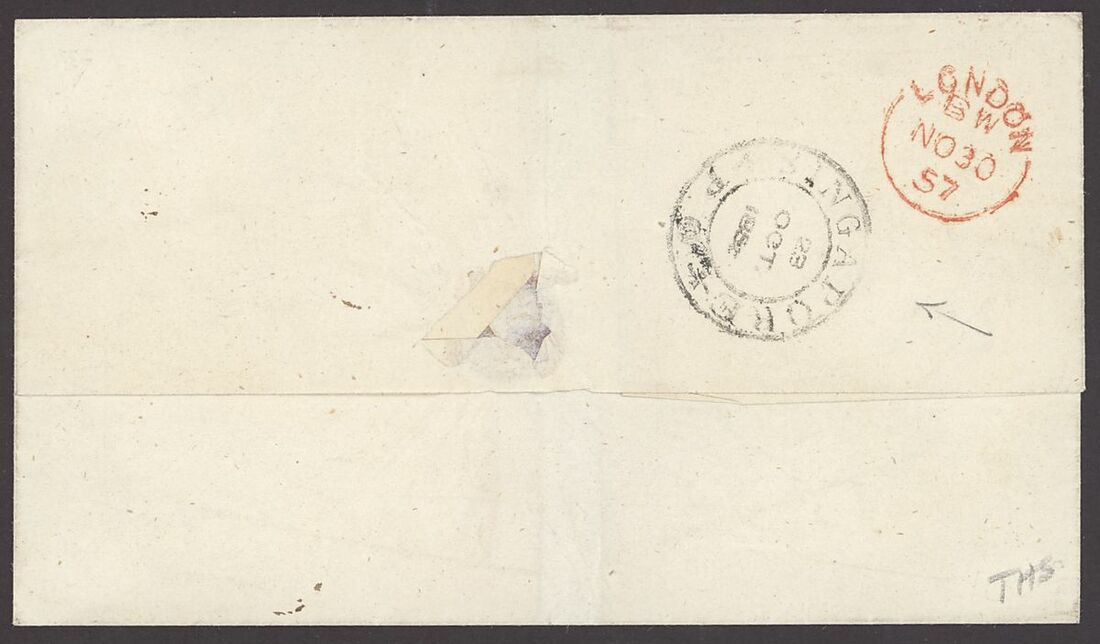 1857 (23 Oct.) entire to London, marked "via Marseilles", rated "9" and showing, on reverse, clear