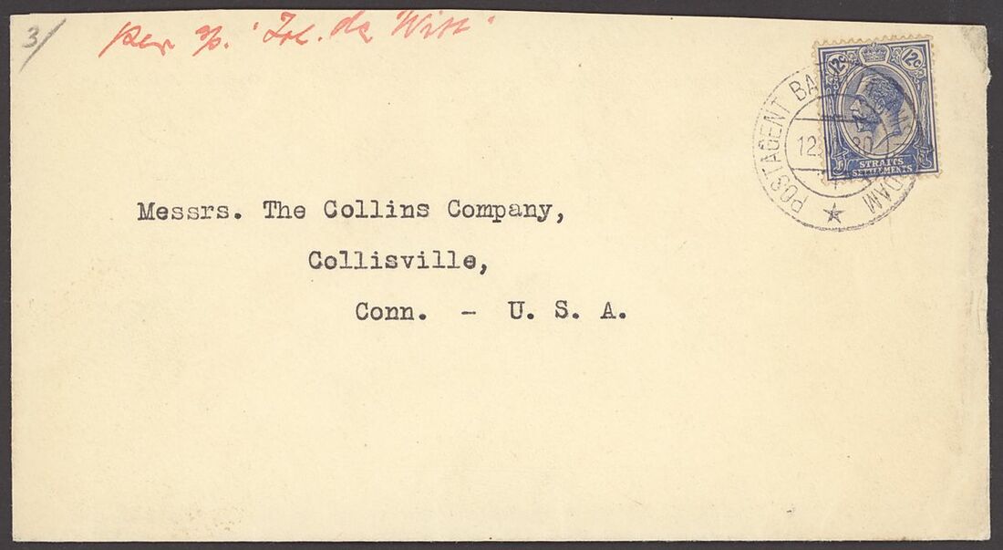 1930 (12 July) envelope to USA, marked "per S/S Tol de Witt", bearing 12c. tied by