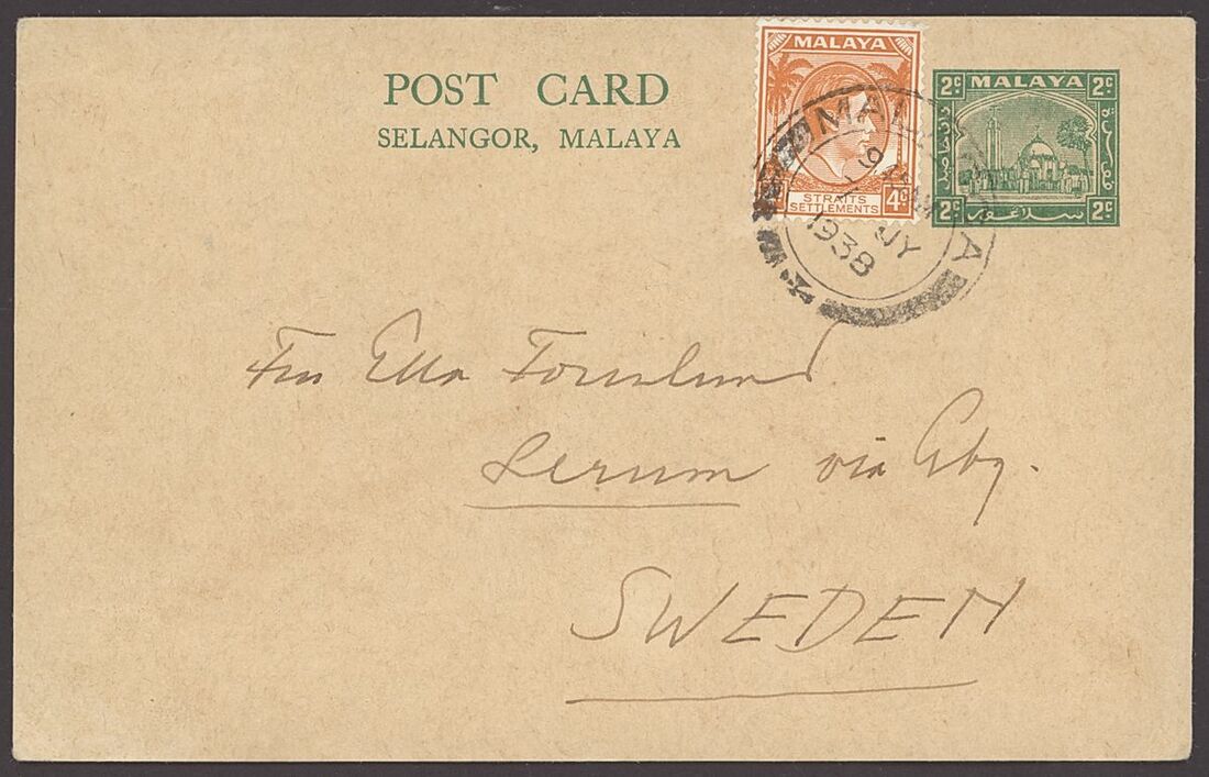 1938 (7 July) Selangor 2c. staionery card to Sweden bearing Straits 4c. tied by