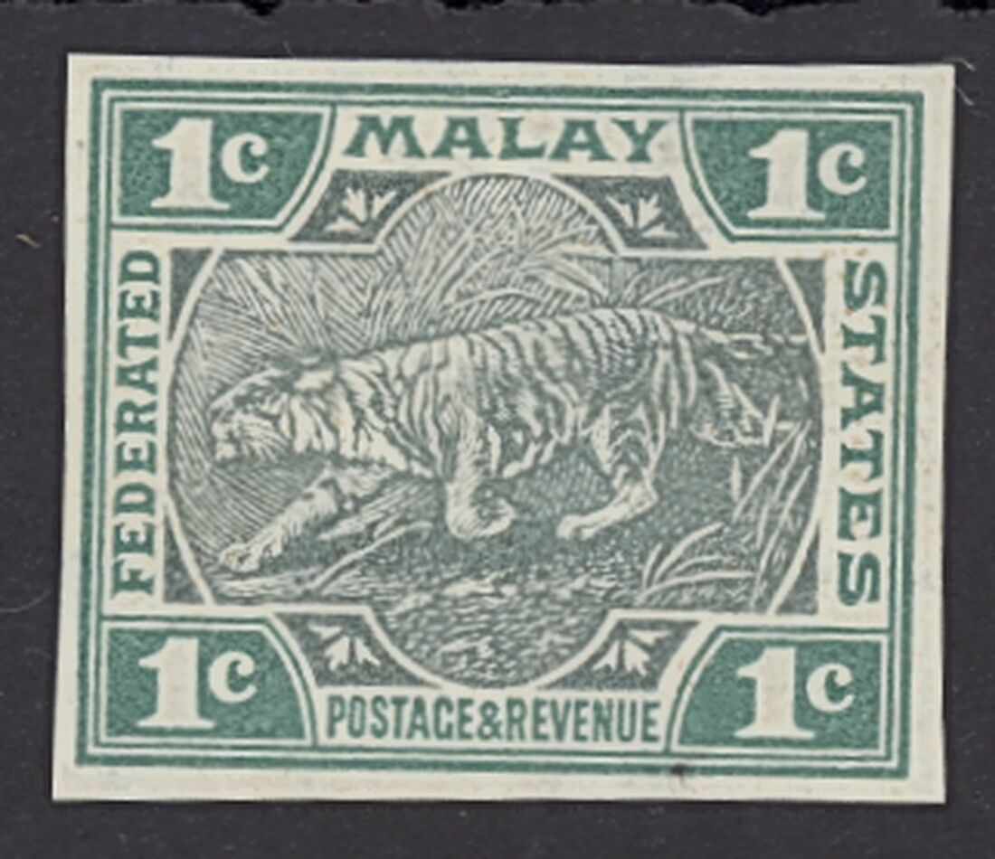 1900 1c. imperforate essay with tiger face left, in dull green and green on gummed CA watermarked paper, fine