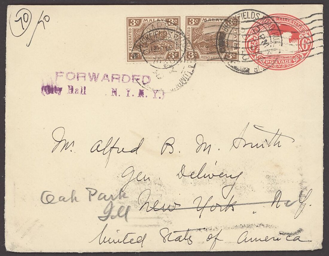 1930 (25 July) 6c. red envelope to New York and re-addressed to Illinois, uprated with 3c. (2), cancelled by