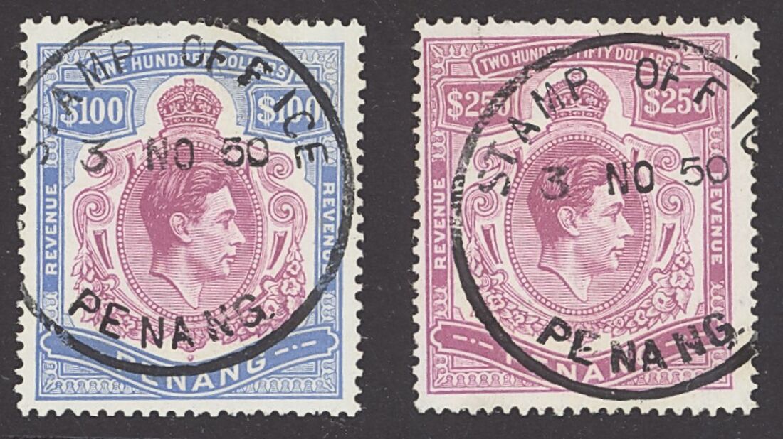 1947 $100 bright purple and blue and $250 mauve, both cancelled by