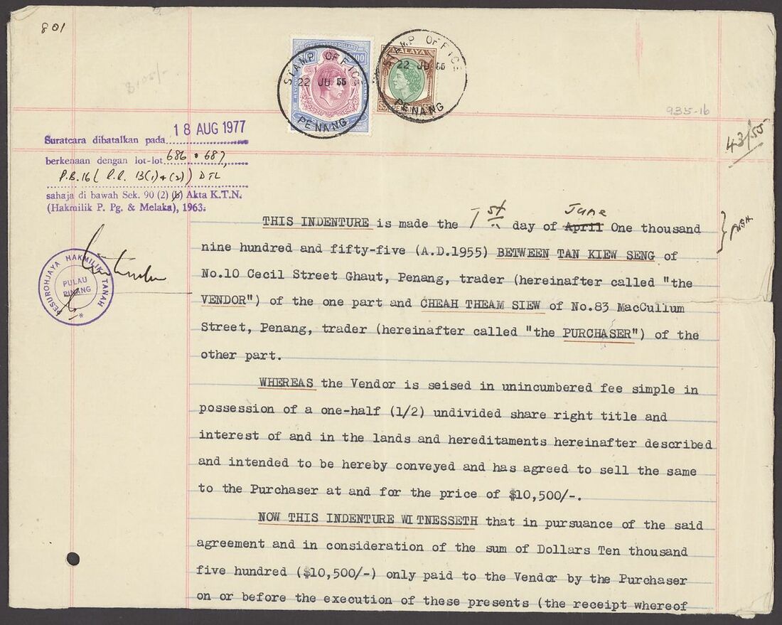 1955 (22 June) indenture bearing 1947 $100 bright purple and blue plus Postage 1955 $5, both clearly cancelled by