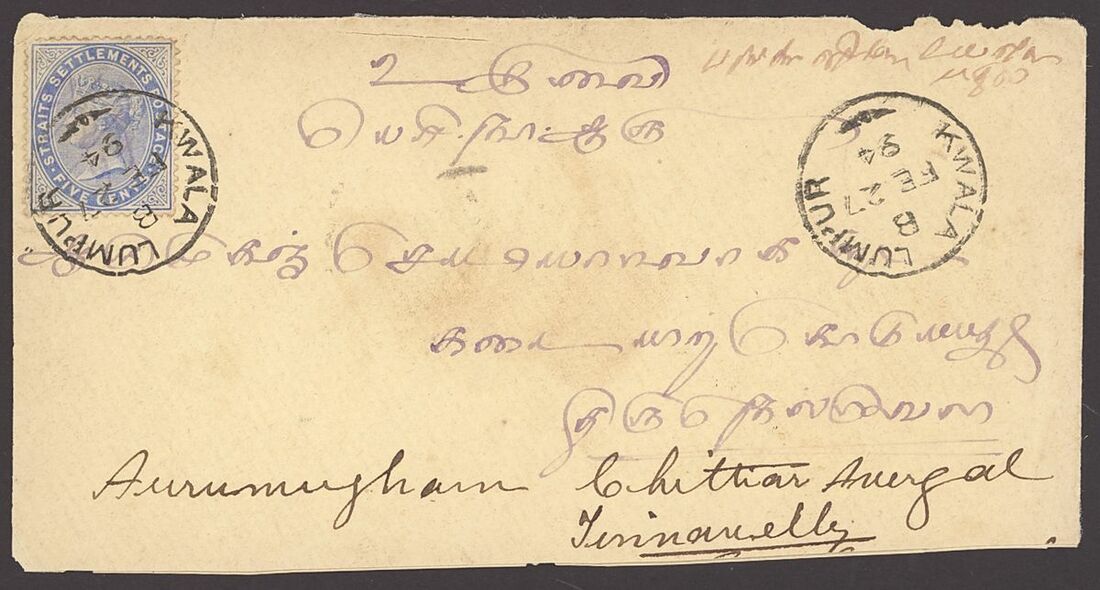 1894 (27 Feb.) envelope to India, bearing Straits Settlements 1883 5c. tied by