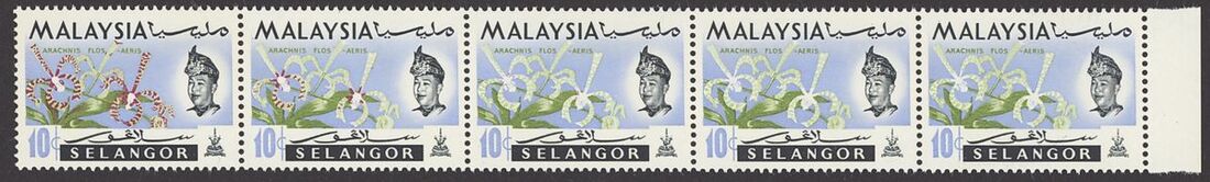 1965 Orchids 10c. marginal strip of four, the right-hand pair with red completely ommited, the second stamp with tiny traces, gum a touch off-white otherwise fine unmounted mint. S.G. 140a, £260+
