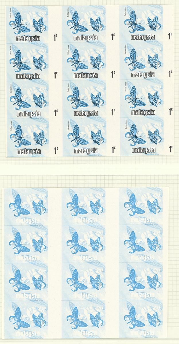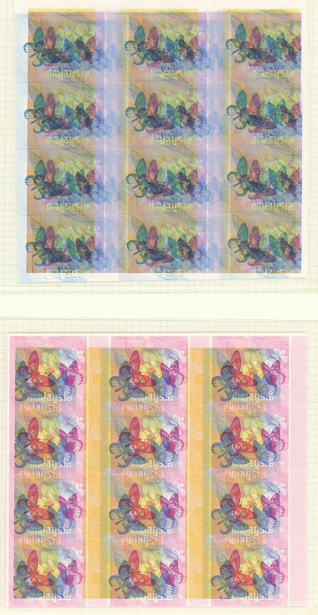 1971-78 Butterflies, Bradbury Wilkinson 1c. imperforate colour separation proofs comprising cyan block of twelve (3x4), magenta block of sixteen (4x4), yellow block of twelve (3x4), cyan and black block of twelve (3x4), and three blocks of twelve (3x4) of various colour combinations, all misplaced. A fine lot