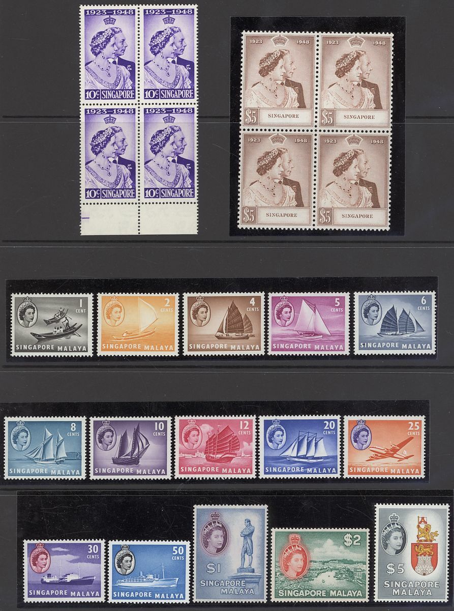 1948 Silver Wedding 10c. and $5 blocks of four, and 1955-59 1c. to $5 set of fifteen, fine unmounted mint. S.G. 31-32, 38-52, £534