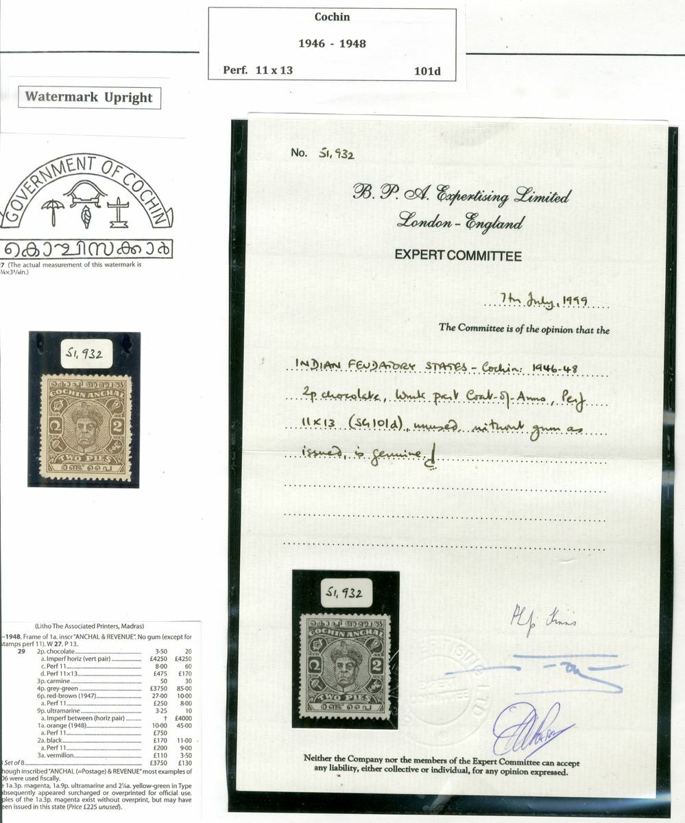 1946-8, 2p chocolate, watermark part Coat of Arms, without gum as issued, perforated 11x13, some typical feathered perfs, else a fine example of this scarce perforation variety; with 1999 B.P.A. certificate. (S.G. 101d, £X; Sc. 82b, $550)