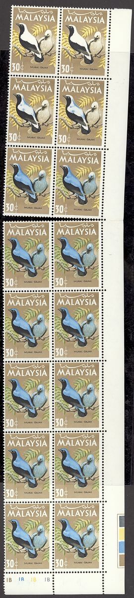 1965 Birds 30c. Blue-backed Fairy Bluebird, a lower right corner block of sixteen (2x8) with plate numbers and colour bars, the top pair with blue (plumage) omitted), the second pair with blue largely omitted and the third pair with trace of blue omitted, perfs split between third and fourth rows, unmounted mint. S.G. 21a, £750+