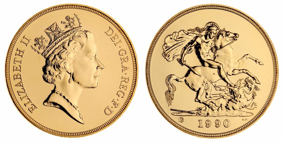 (g) Elizabeth II (1952- ), Brilliant Uncirculated Five Pounds, 1990, crowned head right, rev. St George and dragon, milled edge, 12h, 40.00g (Spink SE4), very faint hairline to obverse field, otherwise brilliant and as struck, in original Royal Mint case of issue, No. 0622. One of 1,226 struck