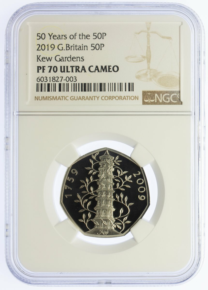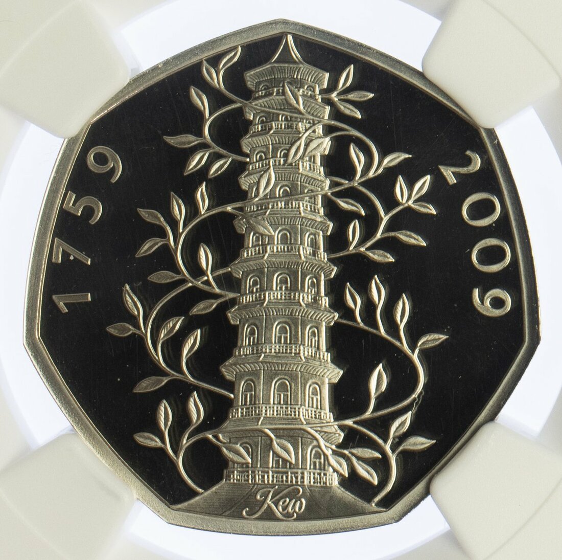 PF70 Ultra Cameo | Elizabeth II (1952-), Silver Proof Fifty Pence, 2009, 250th Anniversary of the foundation of the Royal Botanical Gardens, Kew, ELIZABETH. II D.G. REG. F.D FIFTY PENCE, crowned head right, rev. pagoda, plain edge, 12h, (Spink H19), brilliant as struck, in NGC holder, graded PF70 Ultra Cameo (Cert. #6031827-003)