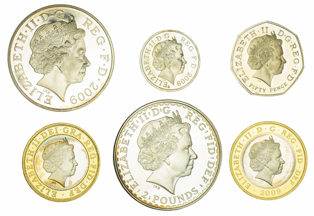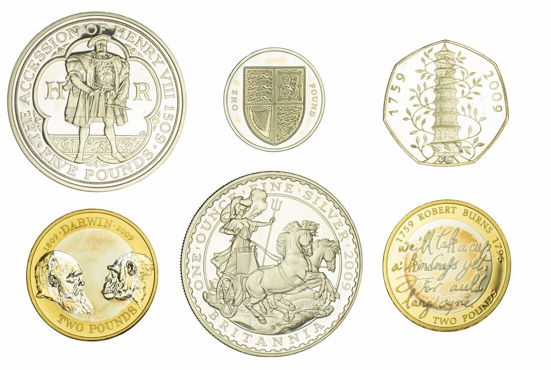 Elizabeth II (1952-), Family Silver Proof Collection (6), 2009, 'Accession of Henry VIII' Five Pounds; Britannia Two Pounds 'Charles Darwin' Two Pounds; 'Robert Burns' Two Pounds; 'Royal Shield' One Pound; 'Kew Gardens' Fifty Pence (Spink PSS38), with some light toning spots, otherwise brilliant as struck, in Royal Mint case of issue, No. 0505 (6)