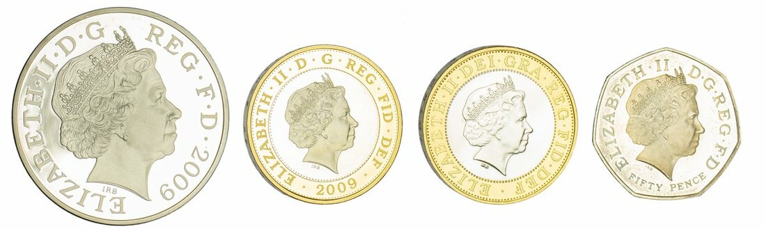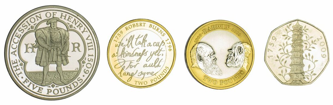 Elizabeth II (1952-), Silver Proof Piedfort Four Coin Set, 2009, 'Accession of Henry VIII' Five Pounds; 'Charles Darwin' Two Pounds; 'Robert Burns' Two Pounds; 'Kew Gardens' Fifty Pence (Spink PSS39), some speckled toning marks to the Fifty Pence, otherwise brilliant as struck, in Royal Mint case of issue, No. 1292 (4)