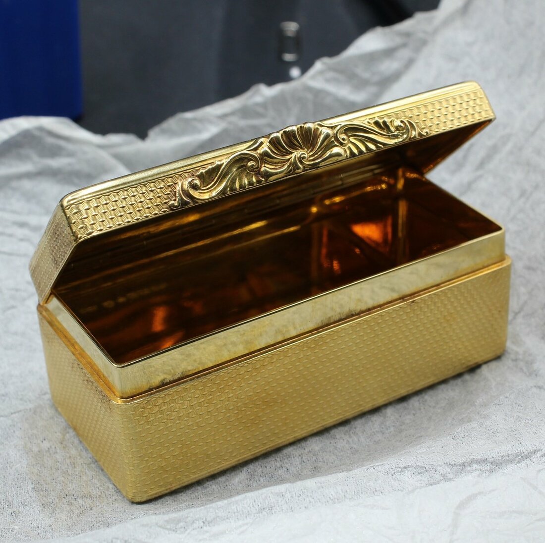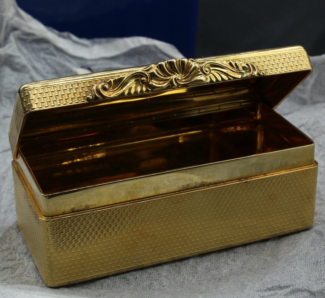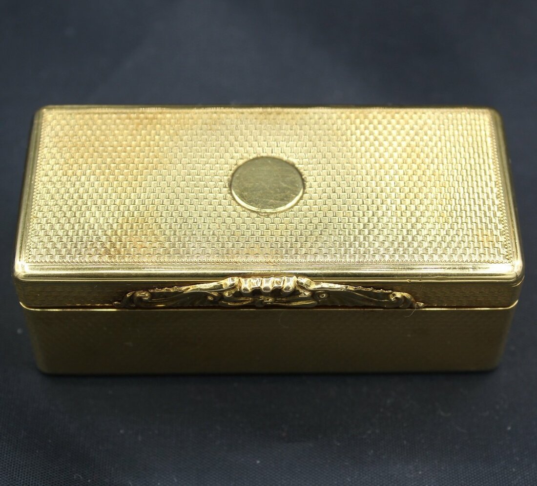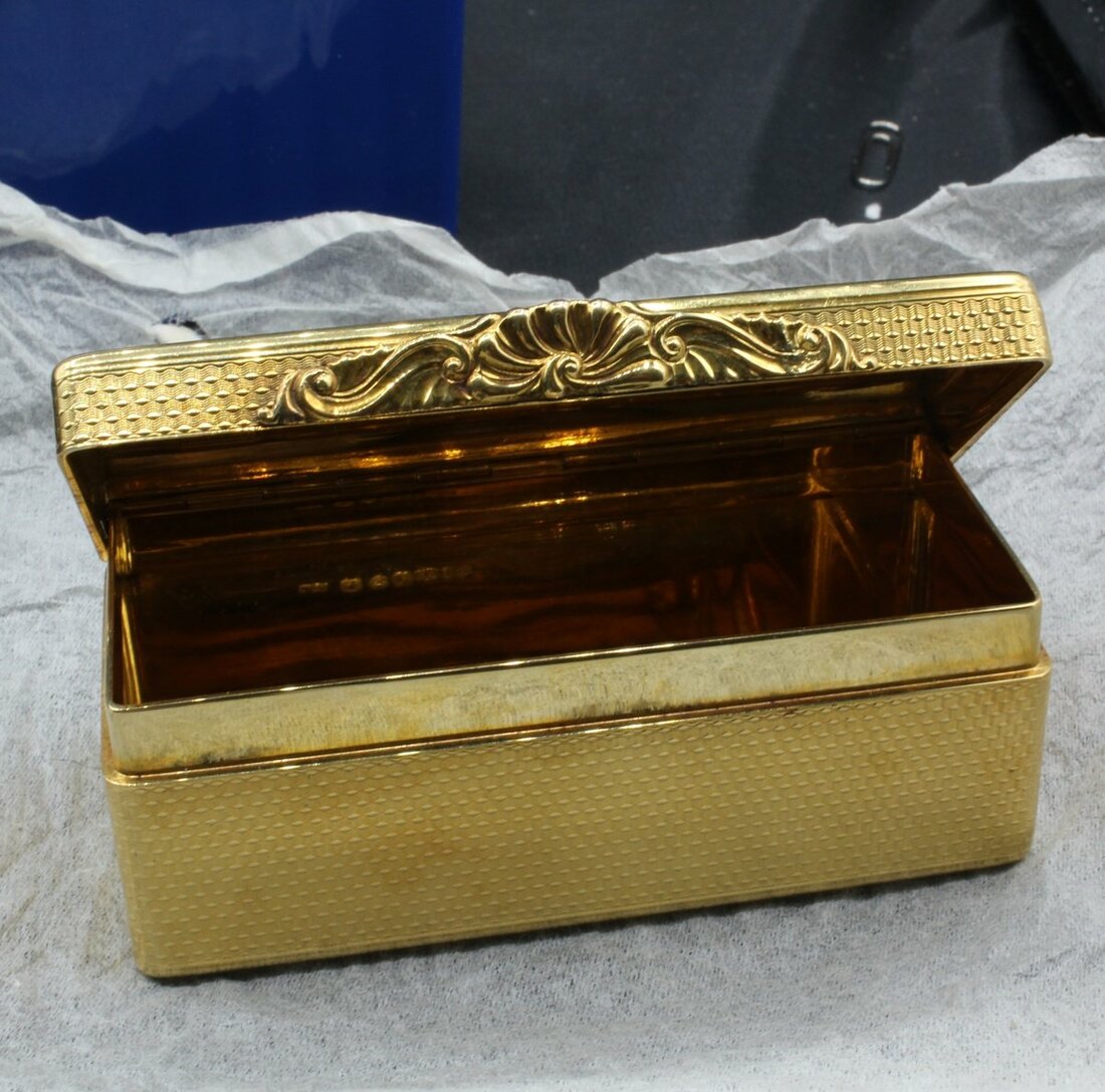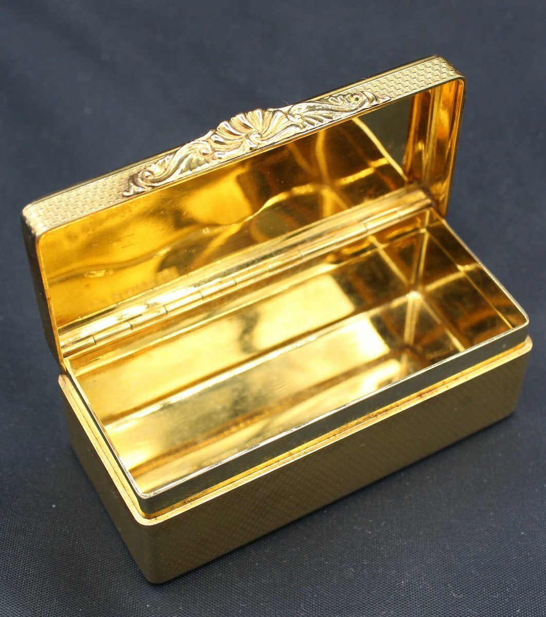 A Superb George IV 18ct Gold 'Snuff' Box, by A J Strachan, London, k [1825], 133.02g, in excellent condition, the cartouche unmarked and the hinge in perfect working order, some light merchant etchings on internal lid, otherwise good extremely fine, an exemplary showpiece