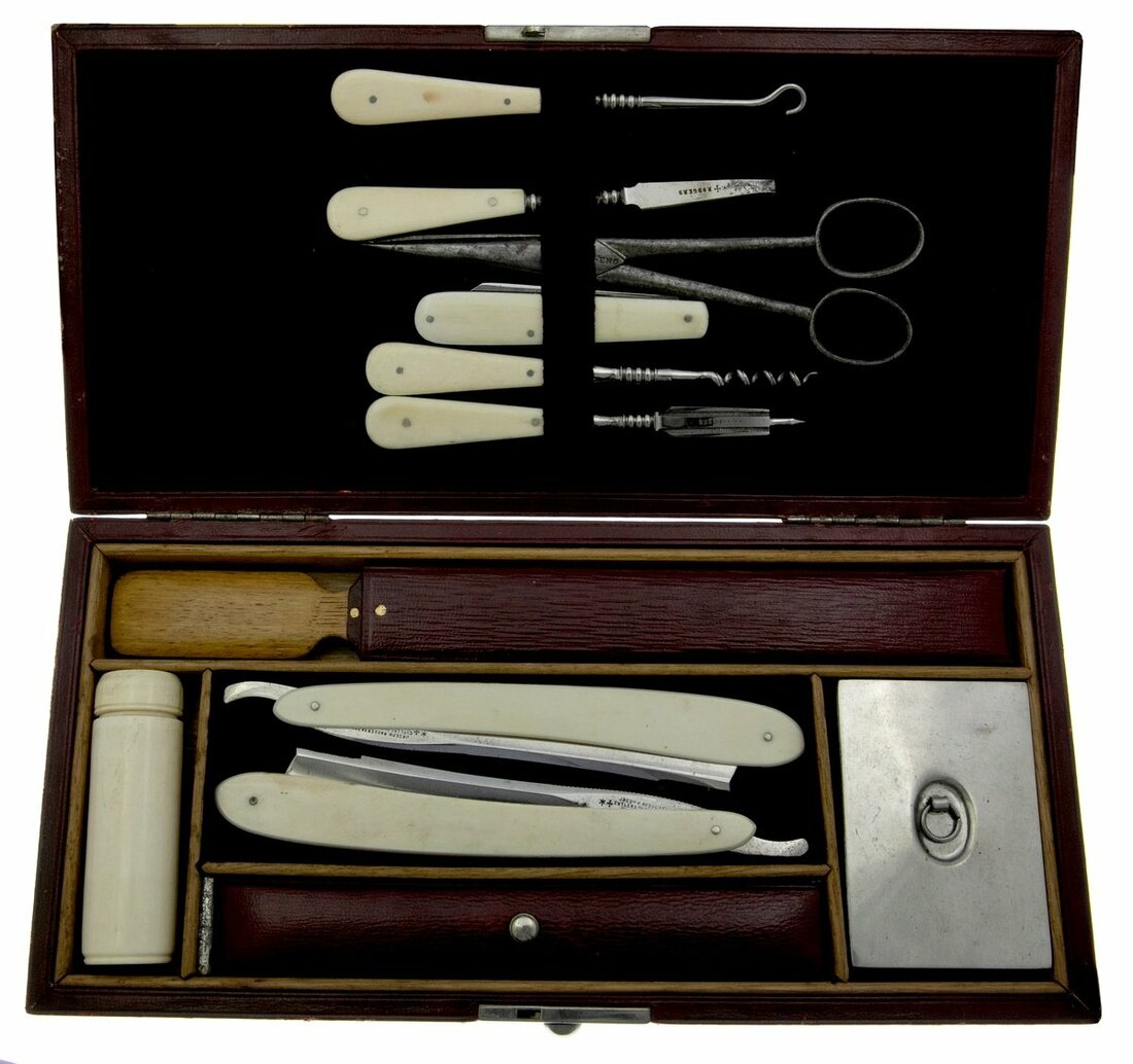 Large Rectangular Red Leather Boxed Gentleman's Travelling Vanity Set, complete set, with various implements, including two ivory handled razors, shaving brush, and full set of other personal tools