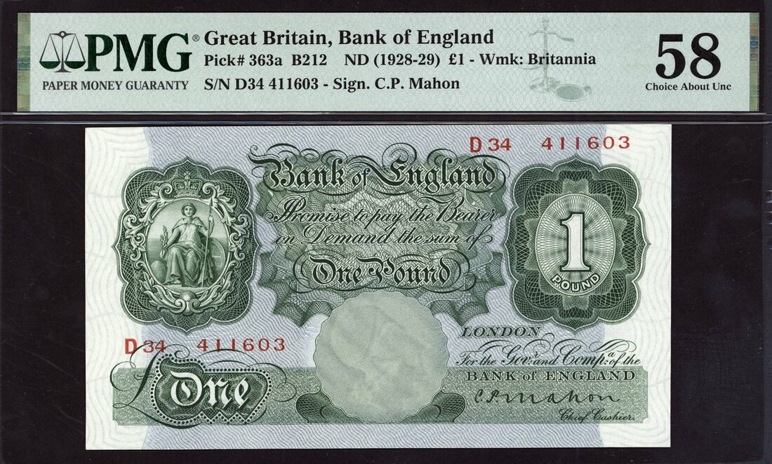 Bank of England, C.P. Mahon, £1, ND (1928), serial number D34 411603, (EPM B212, Pick 363a), early Britannia pound note, in PMG holder 58 Choice About Unc. Raymond Russell Collection