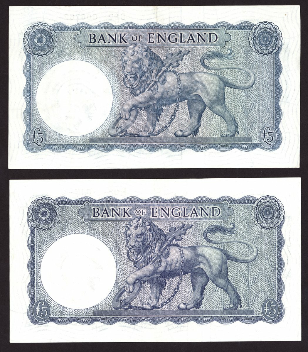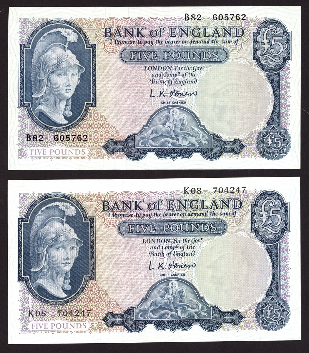 Bank of England, L.K. O'Brien, £5 (2), ND (1957/1961), prefixes B82, K08, (EPM B277, 280), both lightly pressed, good extremely fine (2 notes) Raymond Russell Collection