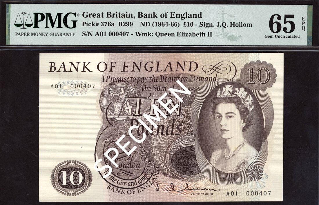 Bank of England, J.Q. Hollom, £10, ND (1964), serial number A01 000407, (EPM B299, Pick 376a), in PMG holder 65 EPQ Gem Uncirculated, first run low number. Raymond Russell Collection