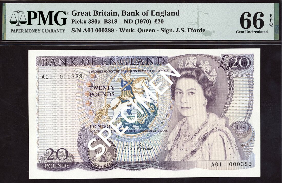Bank of England, J.S. Fforde, £20, ND (1970), serial number A01 000389, (EPM B318, Pick 380a), in PMG holder 66 EPQ Gem Uncirculated, scarce first run low number. Raymond Russell Collection