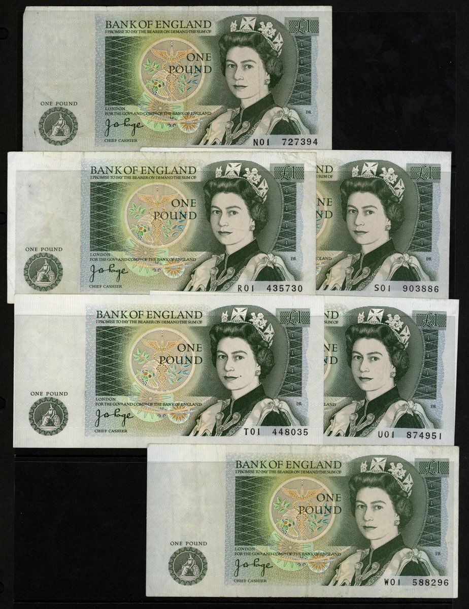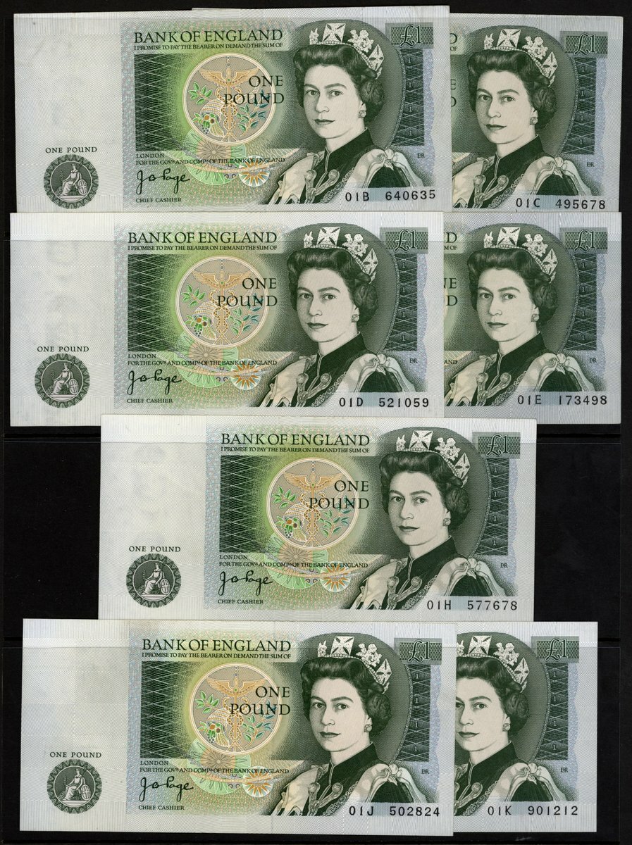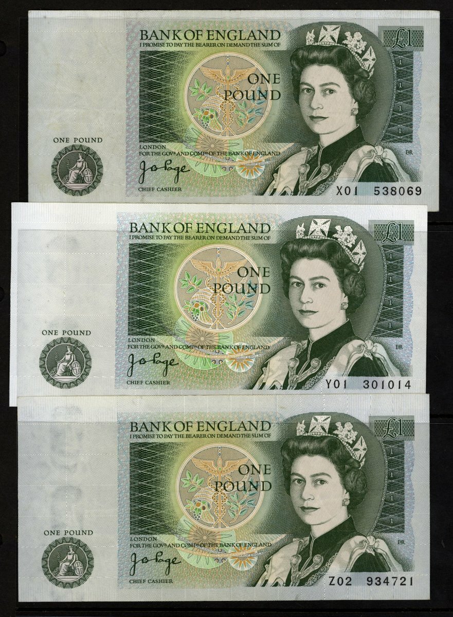 Bank of England, J.B. Page, a group of £1 (37), all 01 prefixes with one Z02, including and A01N and C01N, and a Z02 prefix,
