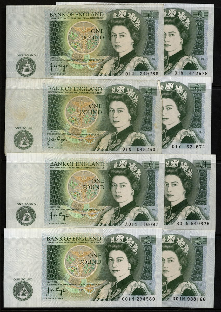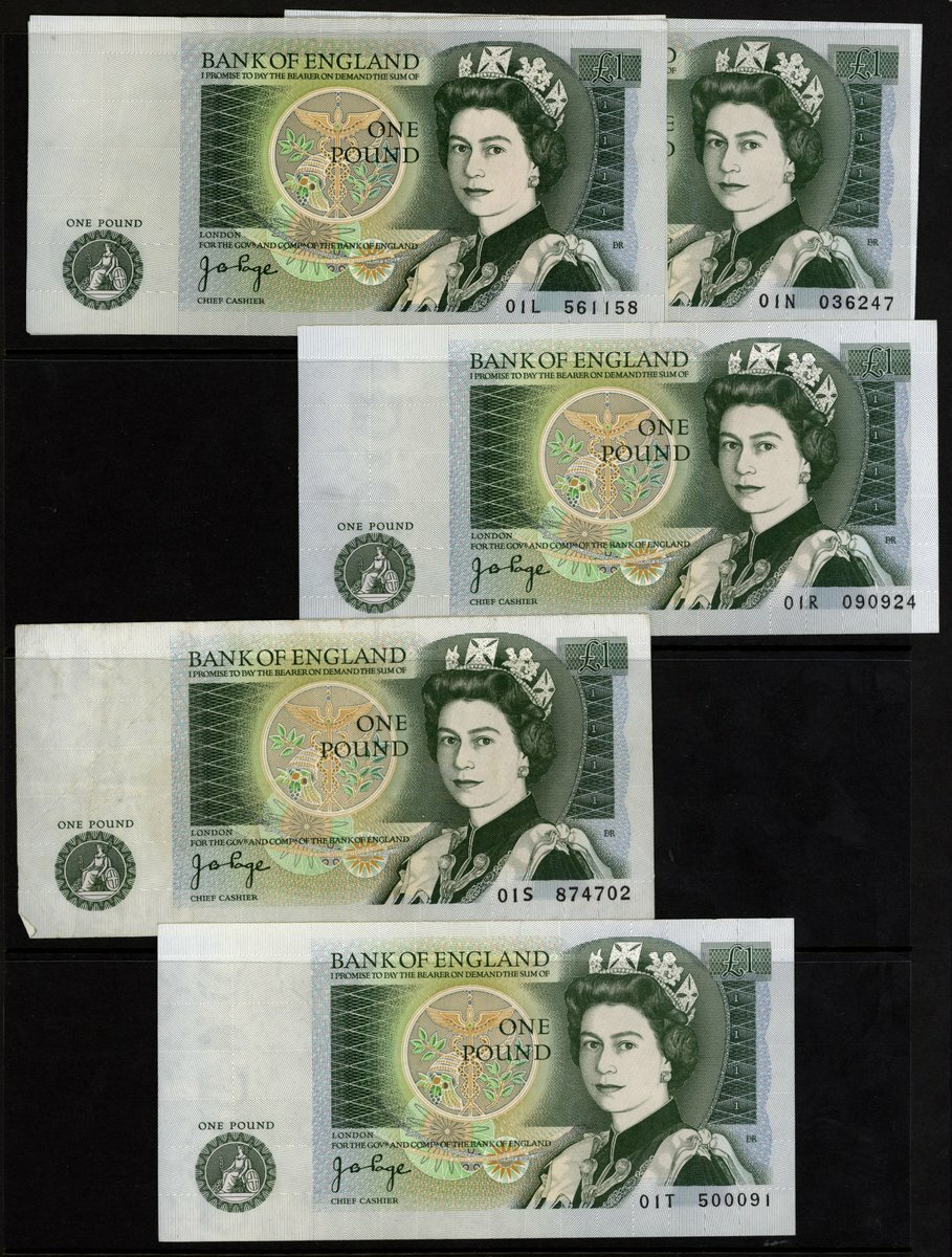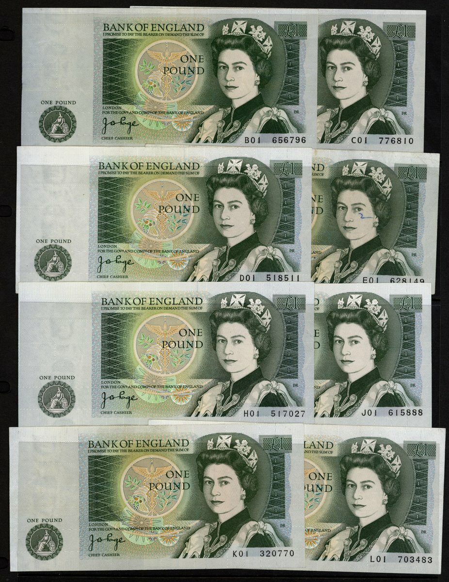 Bank of England, J.B. Page, a group of £1 (37), all 01 prefixes with one Z02, including and A01N and C01N, and a Z02 prefix,