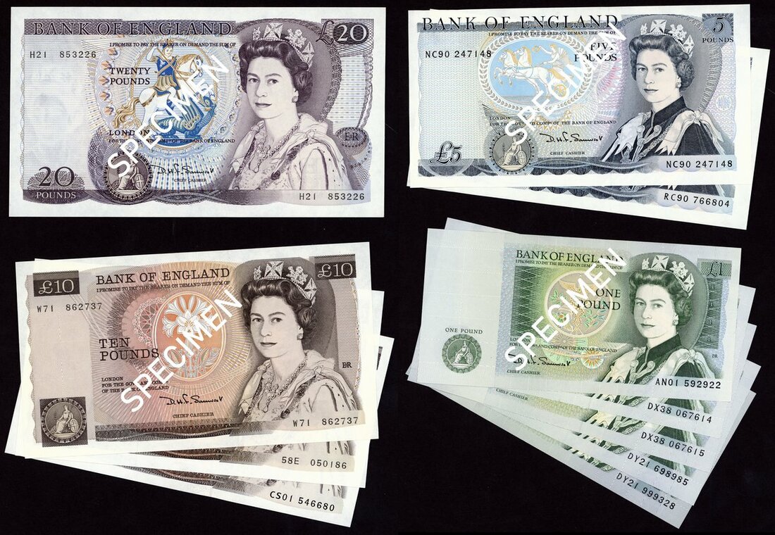 Bank of England, D.H.F. Somerset, including £1 (5) prefixes AN01, DX38 (pair), DY21 (pair including a late serial 999328), £5 (2) prefixes NC90 (last run), RC90 (last run), £10 (3) prefixes W71, 58E, CS01 (first run), £20 prefix H21,