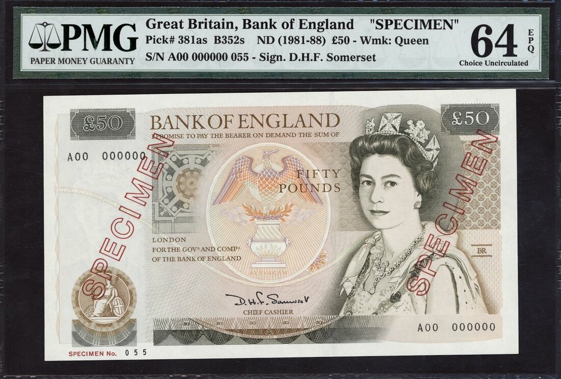 Bank of England, David Henry Fitzroy Somerset, specimen £50, ND (1981), serial number A00 000000, (EPM B352s, Pick 381as), red SPECIMEN overprints, in PMG holder 64 EPQ Choice Uncirculated, rare