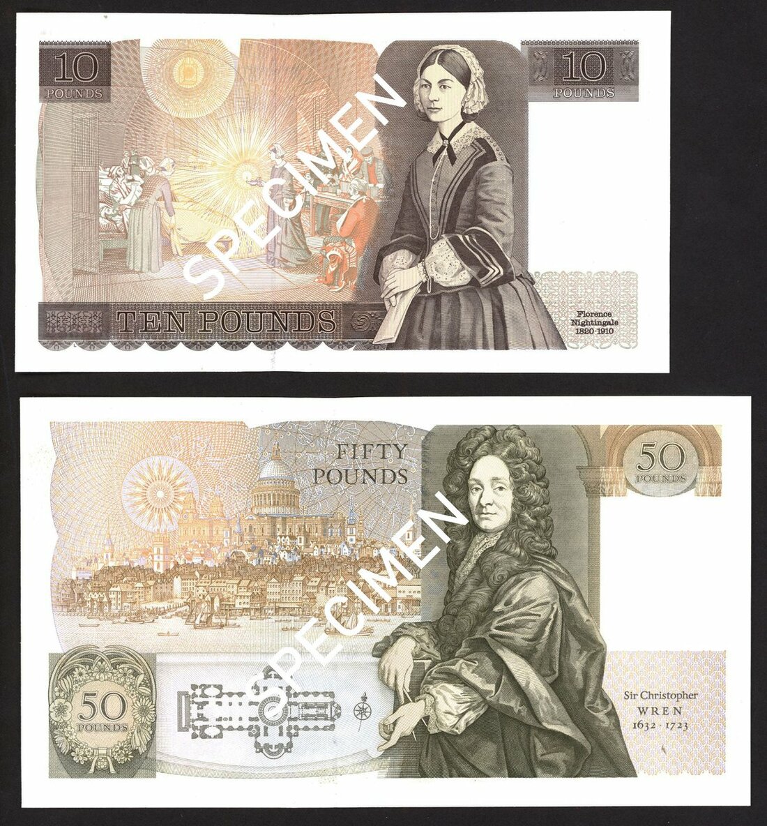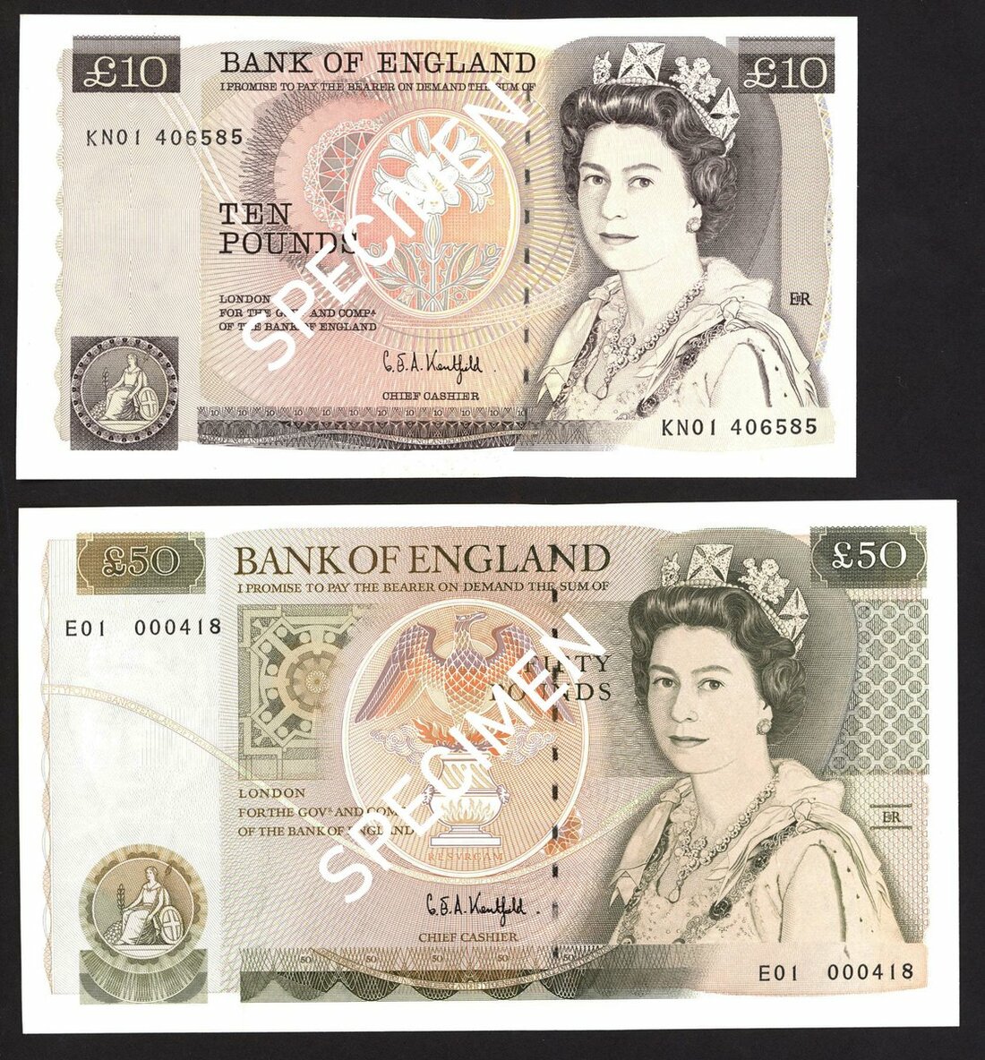 Bank of England, Graham Edward Alfred Kentfield, £10, ND (1991-), prefix KN01, also £10 (2 consecutive with prefix KN37), brown, £50, serial number E01 000418, green